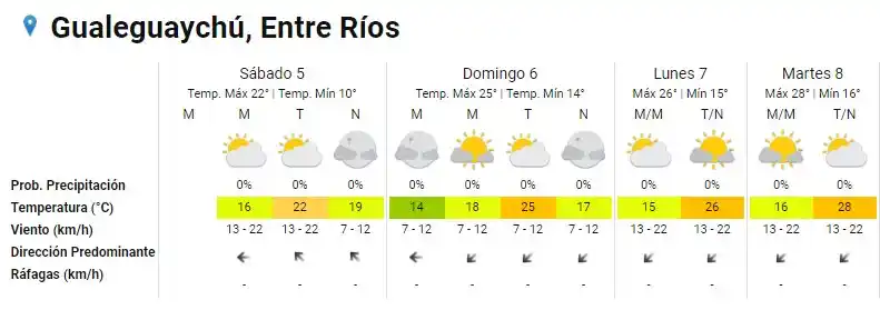 Con temperaturas entre los 10 y los 28ºC y con cielo despejado, se espera un fin de semana largo ideal en cuanto a lo climático. Para este sábado, el SMN indica que estará parcialmente nublado, con una mínima de 10 y una máxima de 22ºC. El resto del finde estará más caluroso. El domingo la temperatura oscilará entre los 14 y los 25ºC, el lunes lo hará entre los 15 y los 26ºC y el martes irá de los 18 a los 28ºC. Para todos estos días se espera cielo parcialmente o algo nublado. Según el pronóstico extendido, se darían precipitaciones recién el próximo viernes.