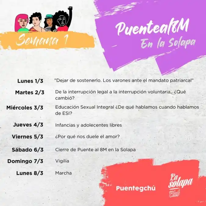 En el marco del 8M, Puente a Gualeguaychú y La Solapa Club proponen actividades formativas y recreativas, con el fin de repensar el rol de la mujer y las minorías. La apuesta es fuerte, igual que la urgente necesidad de discutir nuestro comportamiento como comunidad y cuáles son las consecuencias de los mismos.