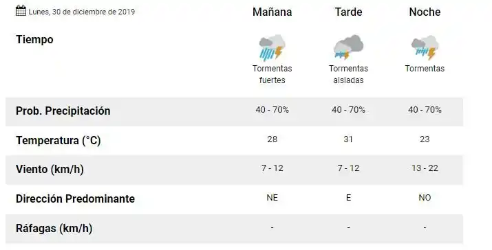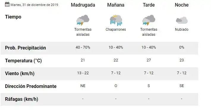 “Sobre parte del área del sur de Entre Ríos se están registrando lluvias y tormentas de variada intensidad, se prevé que durante el día de hoy lunes 30 se generalicen a toda la región, esperándose que algunas de estas tormentas puedan ser localmente fuertes, con abundante caída de agua en cortos periodos, fuerte actividad eléctrica, caída de granizo y ráfagas. Se esperan valores de precipitación acumulada de alrededor de 50mm y 100mm durante la jornada de hoy”, informó una alerta emitida por el Servicio Meteorológico Nacional (SMN) para la zona de Gualeguaychú y el sur de Entre Ríos. Lo cierto es que sobre la ciudad la lluvia se desató alrededor de las 10.30, lo que comenzará a marcar un descenso de la temperatura, sobre todo comparado con el calor abrasador que se vivió este último fin de semana: en concreto, para el lunes se espera una máxima de 31 grados, mientras que el miércoles el termómetro llegará a los 27 grados. Y así como el lunes variaría en tormentas fuertes e intensas, el martes 31 de diciembre, último día del año, los pronósticos varían a tormentas aisladas y chaparrones, con una posibilidad de que el tiempo se componga a partir de las 18 horas. Eso sí, el sol volvería al firmamento recién el jueves, el segundo día de 2020.