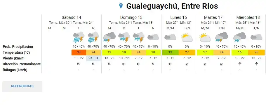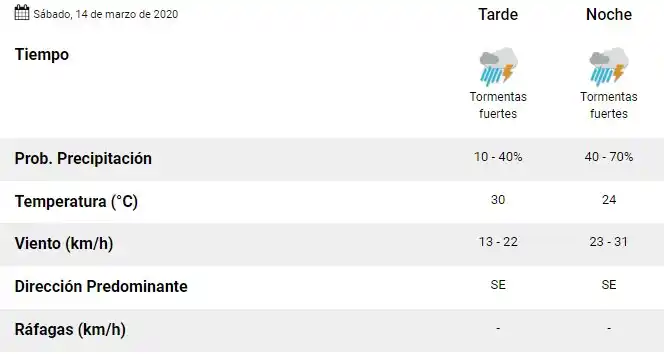 Este fin de semana se espera una abundante caída de precipitaciones en la ciudad. Para este sábado, hay pronóstico de tormentas fuertes durante la tarde y la noche, con temperaturas que no superarían los 30°C. El domingo bajaría considerablemente la temperatura, con una máxima prevista de 24°C. Hay probabilidad de tormentas durante la mañana y la tarde, mientras que cesarían durante la noche. Alerta meteorológica Rige desde las 10 hs. para el Norte y centro-este de la provincia de Buenos Aires, Sur y centro de Córdoba, Entre Ríos, Noreste de La Pampa, San Luis, Sur y centro de Santa Fe, Ciudad Autónoma de Buenos Aires y Río de la Plata El área de cobertura será afectada durante el día de hoy por tormentas, algunas localmente fuertes, que pueden provocar en forma localizada ráfagas, fuerte actividad eléctrica, abundante caída de agua en cortos períodos y ocasional caída granizo. El pronóstico extendido: