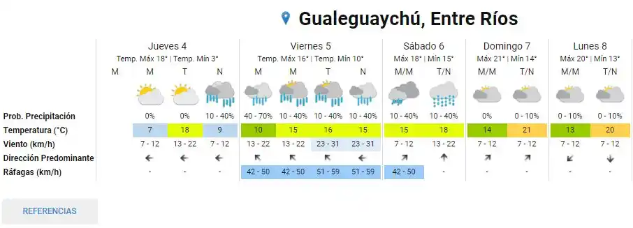 Sobre el área de cobertura, que comprende a nuestra provincia y al sur de Corrientes y centro y norte de Santa Fe, se esperan lluvias intensas y algunas tormentas a partir de la noche de este jueves y durante todo el viernes. Se esperan valores de precipitación acumulada entre 60 y 100 mm pudiendo ser superados en forma puntual. Los mayores valores se prevén en el centro y norte de Entre Ríos en el transcurso del viernes 5. Gualeguaychú El pronóstico para nuestra ciudad indica de un 10 a un 40% de probabilidades de precipitaciones para la noche de este jueves, mientras que ese porcentaje aumenta a 70% para la madrugada del viernes, y se mantiene la amenaza de lluvias durante el resto de la jornada. Las precipitaciones se extenderían hasta el sábado, mientras que el domingo ya cesarían y el cielo estaría mayormente nublado.