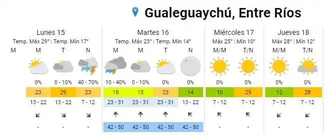 El fenómeno tendría lugar entre este lunes por la noche y durante la madrugada del martes. En este sentido, los primeros departamentos afectados serían Gualeguay y Victoria. Con el correr de las horas, las lluvias llegarían a los departamentos de Diamante, La Paz, Nogoyá, Paraná, Villaguay, Concordia, Federación, Federal, Feliciano y San Salvador. "El área será afectada por tormentas de variada intensidad, algunas fuertes, pudiendo estar acompañadas por intensas ráfagas, muy fuerte actividad eléctrica, ocasional caída de granizo y fundamentalmente abundante caída de agua en cortos períodos", destacan en el informe del SMN. Los valores de precipitación acumulada oscilarían entre los 20 y 40 milímetros, pudiendo ser superados de forma puntual. Luego, habría una disminución de las temperaturas.