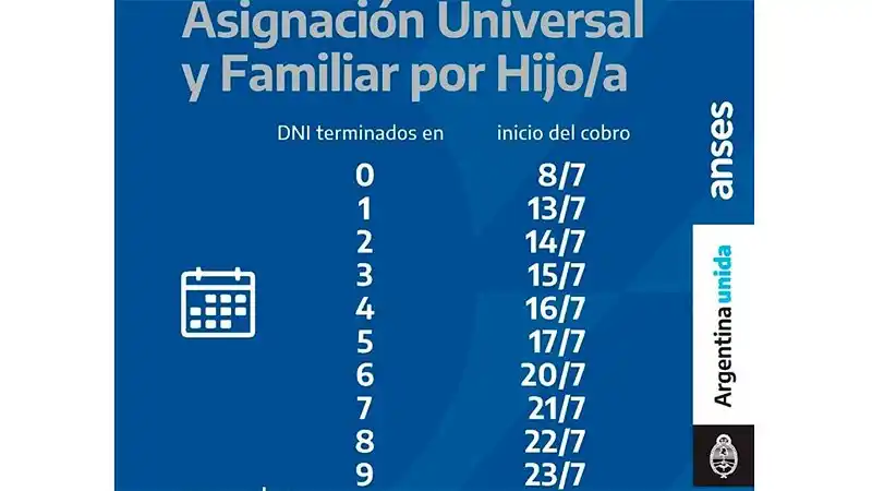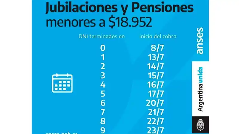 Este miércoles comenzará a efectivizarse uno de los cronogramas de Anses para el mes de julio. Será para el caso de las pensiones no contributivas. Los pagos, en todos los casos se harán según la finalización de DNI. Por otra parte, desde el organismo informaron que las jubilaciones y pensiones inferiores a 18.952 se pagarán entre el 8 y el 23 de julio. En tanto, los haberes que superen ese monto estarán a disposición del 24 al 30 de ese mes. Sobre la Asignación Universal y Familiar, se confirmó a este medio que se efectivizarán del 8 al 23 de julio.