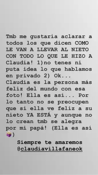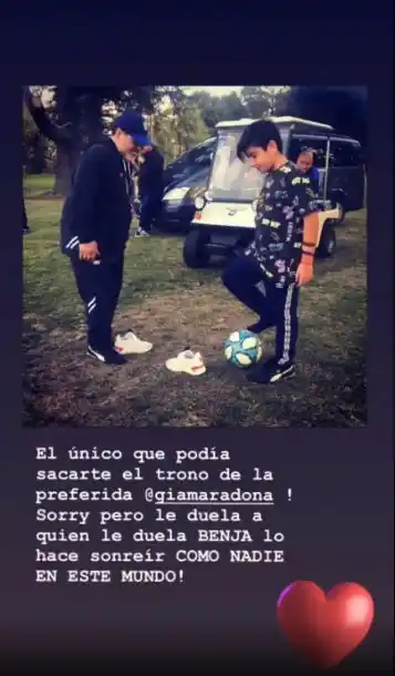 “Sobran las palabras”, escribió Gianinna Maradona en su cuenta de Instagram donde compartió el reencuentro entre su papá, Diego Maradona, y su hijo Benjamín Agüero. El abrazo entre abuelo y nieto tuvo lugar en Estancia Chica, el predio donde se entrena Gimnasia y Esgrima La Plata, cuyo equipo de fútbol actualmente es dirigido por el Diez. Dejando de lado las peleas, los reproches y los escándalos que rodean a la familia, Gianinna se acercó mucho más a su padre en los últimos meses, basándose en la relación de amor que los unía, compartiendo fotos de su infancia y demostrando su apoyo a su papá. “Yo vivía tranquila. Y ahora soy hincha del Lobo”, escribió incluso a mediados de septiembre sobre la nueva etapa de Maradona como DT en Argentina. Esta vez, las fotos y la información salieron desde el propio seno de la familia, sin dar lugar a especulaciones sobre el encuentro. Ginainna incluso confesó que fue Lucho Strassera –su ex novio- quien hizo posible el encuentro. “Todo tuyo el encuentro @luchostrassera ¡¡Gracias!! ¡Sos inmenso! Cuando sos culona como yo, tenés un ex que ama a tu hijo y vale por mil”, se sinceró la diseñadora sobre su ex pareja, con quien mantuvo una relación entre 2013 y 2015. Por su parte, Dalma Maradona también se hizo eco del encuentro y realizó una especie de descargo ante las críticas, indicando también cómo había reaccionado Claudia Villafañe ante lo sucedido. “Me gustaría aclarar a todos los que dicen, ¿cómo le van a llevar al nieto con todo lo que le hizo a Claudia?”, se preguntó la actriz en sus historias de Instagram. Y respondió: “1: no tenés ni puta idea lo que hablamos en privado. 2: Ok... Claudia es la persona más feliz del mundo con esa foto. Ella es así. Por lo tanto, no se preocupen que si ella ve feliz a su nieto, ya está. Y aunque no lo crean, también se alegra por mi papá. Ella es así. Siempre te amaremos, Claudia”.