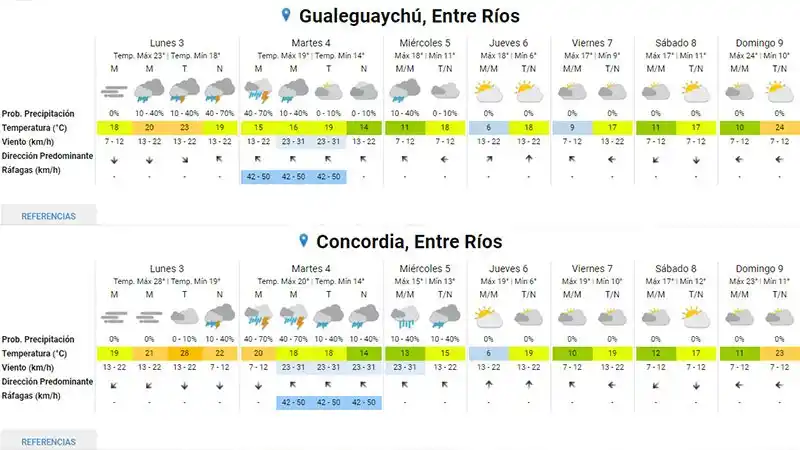Un frente frío avanza hacia la zona central del país generando a su paso algunas tormentas. El meteorólogo Alejandro Gómez había adelantado que a inicios de esta semana llegaría un sistema frontal de aire fresco a muy fresco que al encontrarse con el sistema cálido presenta actualmente daría lugar “a una confluencia de masas que generaría inestabilidad significativa”. El persistente viento norte produjo durante el fin de semana el ingreso de aire templado que produjo incluso temperaturas superiores a 30 grados en algunas zonas del país. De acuerdo con el Servicio Meteorológico Nacional, a partir de esta tarde podrían producirse tormentas aisladas en Entre Ríos y tras ello se produciría un descenso notorio de las temperaturas. A partir de mañana se esperan máximas de entre 15 y 18 grados, mientras que las mínimas podrían descender en nuestra provincia hasta los seis grados el jueves. Alerta amarillo Para Colón, Gualeguaychú, Islas del Ibicuy, Tala y Uruguay rige un alerta por tormentas. Se estima que por la noche “el área será afectada por lluvias y tormentas de variada intensidad y algunas pueden ser localmente fuertes, con valores de precipitación acumulada entre 20 y 60 mm, que podrían ser superados de manera local”. También es posible que “se registren ráfagas, ocasional caída de granizo e intensa actividad eléctrica”.El pronóstico para hoy en Entre Ríos. Vientos débiles del noreste y norte. Poco nuboso a parcialmente nublado. Probabilidad de neblinas matinales. Luego, durante el día, nubosidad y humedad en incremento paulatino. Inestabilizándose. Desmejorando desde el sudoeste de la provincia, con probabilidad de precipitaciones dispersas y ocasionales tormentas. Vientos rotando a débiles y regulares del sur. Por la noche, incremento de la inestabilidad. Los departamentos más inestables serían los del centro y sur provincial.