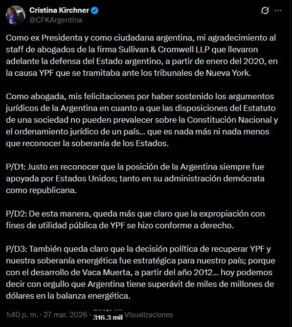 La expresidenta Cristina Kirchner se pronunció tras el fallo de la Justicia de Estados Unidos en la causa por YPF y destacó la labor de los abogados que defendieron al Estado argentino en los tribunales de Nueva York. En la red social X, la exmandataria agradeció al equipo jurídico de la firma Sullivan & Cromwell LLP, que llevó adelante la defensa desde 2020, y resaltó que lograron sostener la postura argentina en torno a la primacía de la Constitución Nacional por sobre el estatuto de una empresa.