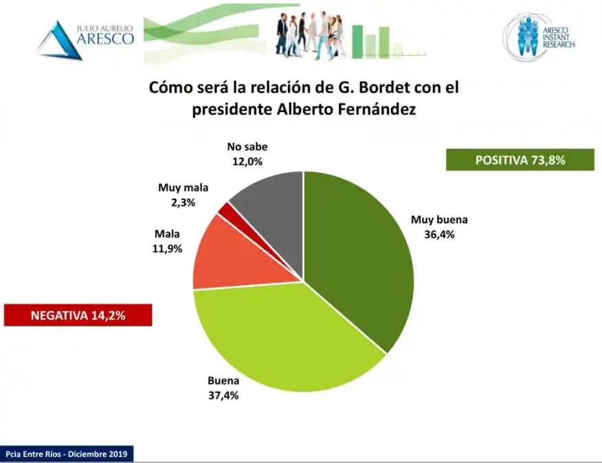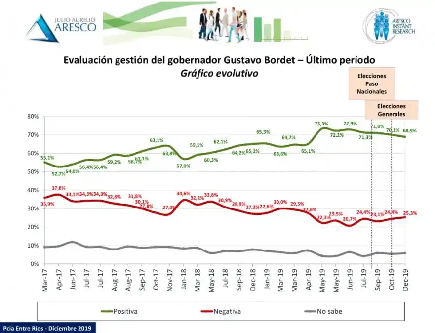 Así se desprende del estudio realizado por la consultora Aresco, de Julio Aurelio. La valoración positiva de la gestión del gobernador Gustavo Bordet llega al 68,9 por ciento de los entrerrianos, lo que refleja un crecimiento de casi 14 puntos desde el 2017. Además, el 73,8 por ciento considera positiva la relación del mandatario con el presidente electo, Alberto Fernández. La gestión del gobernador Gustavo Bordet atraviesa uno de los momentos más altos en la consideración de los entrerrianos. El 68,9 por ciento de la población evalúa positivamente su paso en la máxima magistratura de la provincia, una tendencia que se consolidó con el avance de la administración desde 2015 hasta la fecha. El estudio de Aresco se realizó en diciembre, en toda la provincia. El universo fue la población mayor de 16 años en condiciones de votar, y la muestra seleccionada contó con 3.000 casos distribuidos por edades, sexo, ubicación geográfica y sectores sociales. "Muy buena gestión en general, buena administración"; "fue dialoguista, buscó consensos para gestionar"; "se centró en la provincia, Entre Ríos está avanzando"; "es honesto, transparente, no es corrupto"; "cumplió con los sueldos a tiempo"; "es serio, responsable, capacitado para el cargo", fueron algunos de los comentarios más destacados que recogió el análisis. En esa línea, el 55,1 por ciento de los entrerrianos tiene una buena expectativa de la situación económica de la provincia. El 34,1 por ciento cree que será mejor y el 21 por ciento que será mucho mejor. Mientras que sólo el 31,2 por ciento cree que será negativa. Además, se destaca que el 73,8 por ciento considera positiva la relación del mandatario provincial con el presidente electo, Alberto Fernández. Salud económica Por otra parte, un estudio de opinión pública realizado por el Grupo Mercado en la ciudad de Paraná resalta la preocupación de la población por el contexto económico del país y advierte las moderación de las expectativas en el plano nacional. “Llevara mucho tiempo para que se arreglen las cosas”, sintetiza el informe. Sin embargo, "se considera que Entre Ríos se encuentra en una situación más positiva que otras provincias o en relación a la Nación en general. Más tranquila, más previsible y con menos conflictividad", señala el trabajo. También, la encuestadora subraya "la consolidación del concepto transparencia y honestidad en relación a la gestión Bordet". "Haber llevado adelante a la provincia sin grandes sobresaltos, en un contexto nacional muy difícil y poner a la provincia en caja", son algunas de las afirmaciones de los encuestados por el grupo Mercado a fines de noviembre. Se destacaron, además, la previsibilidad y seguridad que da a las economías domésticas el cronograma de pagos de la provincia, que fue acotado a los primeros días del mes. Esto generó "buen humor" en la población, lo que es visto "como síntoma de buena salud económica". En esa misma línea, los encuestados advirtieron una revalorización del empleado público, así como también otros "logros de gestión", como "algunas obras públicas, especialmente rutas" entre las que se mencionan los accesos norte y sur a la ciudad de Paraná. De acuerdo al análisis de focus group realizado por el Grupo Mercado, la imagen del gobernador Gustavo Bordet es "ampliamente positiva" ya que "se lo ve como un dirigente honesto" con un "perfil bajo", en el que se destacan valores como la moderación, la humildad, la seriedad y el hecho de que fue capaz de mantener relaciones productivas y “sanas” con Nación, a pesar de ser de un signo político diferente. Próxima gestión Bordet asumirá su segundo mandato junto a la actual ministra de Desarrollo Social, Laura Stratta, como vicegobernadora. Lo hará el 11 de diciembre frente a la Asamblea Legislativa, en el recinto de la Cámara de Diputados. Es conocida la vocación de Bordet por impregnar la etapa que viene de una fuerte épica productivista en busca de resultados concretos. Este punto fue confirmado al conocerse la creación del Ministerio de Producción, Turismo y Desarrollo Económico, que viene a reforzar el vínculo de trabajo con las empresas, productores, emprendedores y las cadenas de valor entrerrianas. Es el propio mandatario quien ha confirmado un intenso plan de obras y reformas tendientes a apoyar a la producción y a la industria entrerriana, y así generar puestos de trabajo genuino. Para eso, Bordet buscará consolidar el buen estado de las cuentas del Estado que, gracias a una sustancial mejora del gasto, ha logrado equilibrio fiscal en el presupuesto, reducir sensiblemente la deuda provincial y disminuir en cuatro puntos la planta de empleados públicos. El programa de gobierno para los próximos cuatro años incluye además fortalecer algunas de las políticas que sido centrales en esta gestión, a saber: la integración y tecnologización de los puertos de la provincia, la puesta a punto de las vías navegables; la inversión en obras viales, en especial los caminos secundarios y terciarios, para sacar la producción; y el robustecimiento de la capacidad energética de la provincia a través del cierre energético del norte entrerriano y la incorporación de fuentes de energías alternativas. Pero la próxima gestión no se agotará solamente en la producción y el trabajo. Se espera que el mandatario entrerriano ratifique el esfuerzo que la provincia viene haciendo para reducir la desigualdad a través de una mayor inversión en políticas sociales; y especialmente en lo concerniente a salud, donde la buena relación del gobernador con el próximo ministro de Salud de la Nación, Ginés González García, permitirá destrabar un componente central, como el Hospital de la Baxada, y también poner en práctica proyectos estratégicos vinculados a los medicamentos.