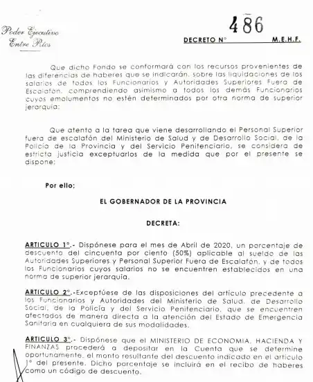 El Gobernador Gustavo Bordet resolvió hoy recortar un 50% de su sueldo y el de varios de sus funcionarios en el contexto por el coronavirus, la pandemia que azota al mundo. La medida fue confirmada en el decreto número 486 y exceptúa a autoridades y funcionarios del ministerio de Salud, servicio penitenciario, Desarrollo Social y la policía que se encuentran "afectados de manera directa a la atención al Estado de emergencia sanitaria". Además llama a los municipios a adoptar la misma medida. "En épocas de restricciones, en la que mucha gente la está pasando mal, y quienes estamos a cargo de llevar adelante la administración y de trabajar justamente en la solución de los problemas, debemos dar el ejemplo. Reduje mi salario y el de los funcionarios políticos en un 50%. Invitamos a los demás poderes, tanto Legislativo como Judicial, Tribunal de Cuentas, otros entes y organismos descentralizados a tomar el mismo criterio" No podemos pedir sacrificios si este sacrificio no empieza por casa.
