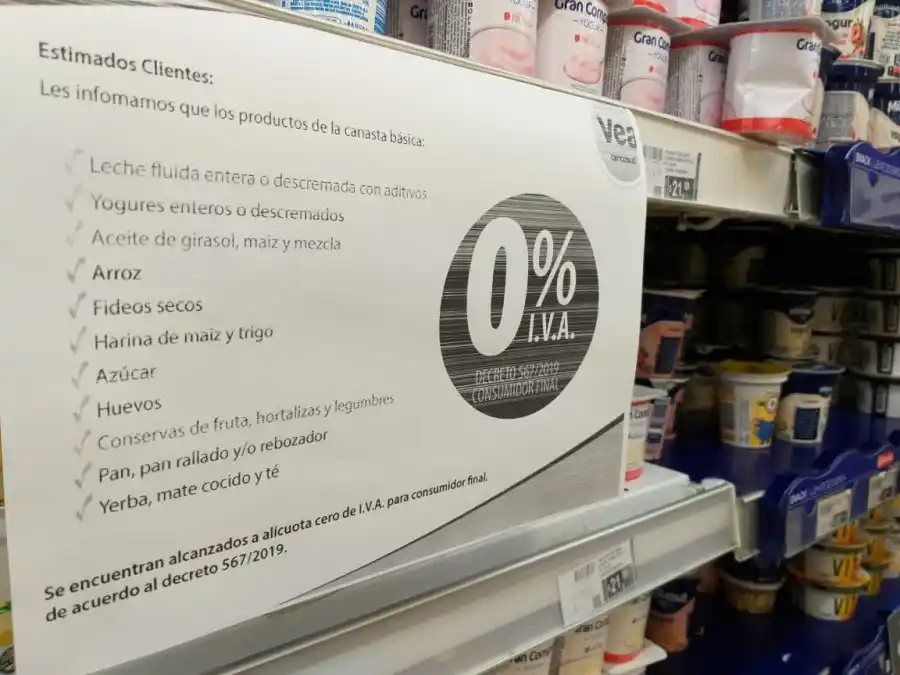 Desde el domingo, tanto Carrefour como Vea exhiben los carteles que promocionan el "IVA 0 %" dispuesto por el gobierno nacional a través del Decreto Nº 567/2019. La norma rige hasta al año próximo. "La leche que estaba $47 ahora está $38", ejemplificaron desde una de las cadenas.