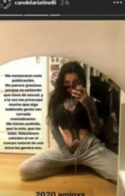 A Candelaria Tinelli le gusta mostrarse sexy en Instagram. Sin embargo, según las autoridades de la red social, a veces incumple con las normas de la comunidad. De hecho, la censuraron y, acto seguido, eliminaron una foto en la que se la veía mostrando el abdomen. Sorprendida e indignada por la censura, Candelaria redobló la apuesta. ¿Qué hizo? Volvió a compartir la foto sexy a través de sus historias e hizo un contundente descargo contra las personas de "mente cerrada". "Me censuraron esta publicación y me parece gracioso porque no entiendo qué tiene de sexual. Y, a la vez, me preocupa mucho que siga habiendo gente tan cerrada mentalmente", escribió junto a la imagen de la polémica. "Me tienen podrida que la cola, que las lolas... Solucionen ustedes si ver el cuerpo natural de una mina les genera eso. 2020 amigos", sentenció, muy enojada.