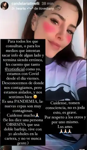 En plena segunda ola de covid, Candelaria Tinelli y Coti Sorokin confirmaron que se contagiaron. Para evitar especulaciones y diversas versiones, la cantante contó que el hisopado de ambos dio positivo y cómo están atravesando la enfermedad. "Para todos los que consultan o para los medios que intentan sacar info de algún lado y termina siendo errónea, les cuento que tanto Coti como yo estamos con covid desde el día viernes. Desconocemos de dónde nos contagiamos, pero estamos aislados y nos sentimos bien”, expresó Cande a través de sus stories de Instagram. Y remarcó que se contagió pese a cuidarse muchísimo: "Es una pandemia, las nuevas cepas son muy contagiosas. Cuídense mucho. Se los dice una persona obsesiva que usa doble barbijo, vive con 30 alcoholes en la cartera y no ve mucha gente”. Antes de cerrar, hizo hincapié en que el contexto es realmente preocupante y que hoy más que nunca hay que estar atentos. “No es joda esto, es grave. Por respeto a los otros y por uno mismo. Lxs amo”, concluyó.