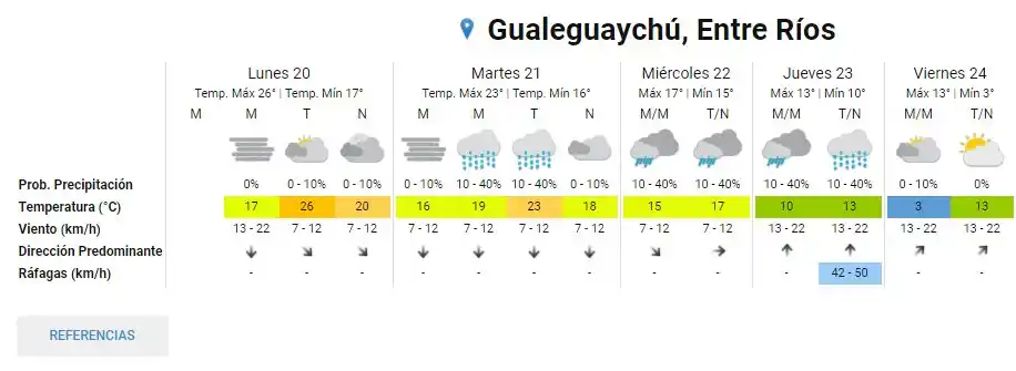 Las jornadas húmedas y con temperaturas más cálidas seguirían en Entre Ríos hasta mediados de semana. Aunque a partir del martes podrían producirse precipitaciones, lo que haría que las marcas térmicas sean inferiores a las del fin de semana. El pulso de aire de origen polar que estará causando descenso marcado de la temperatura en las principales provincias de la región central se haría sentir entre el miércoles y el jueves. Las mañanas más frías, con heladas, se presentarían desde el viernes. Sobre el Litoral, para el día jueves 23, se espera descenso de la temperatura, con viento soplando del sector sur, circulación de regular a fuerte intensidad, con baja sensación térmica. Gualeguaychú Tras un fin de semana muy cálido, este lunes continúa esa tendencia marcando una mínima elevada de 17ºC y una máxima que alcanza los 26ºC, con cielo mayormente nublado durante toda la jornada. Para mañana, según el pronóstico del SMN, se espera que se mantengan las temperaturas elevadas para esta altura del año (16ºC - 23ºC) y hay un 40% de probabilidades de lloviznas. Las precipitaciones se extenderían el miércoles y el jueves, con lluvias aisladas y lloviznas, y la temperatura iría descendiendo paulatinamente, hasta alcanzar el viernes los 3ºC de mínima.