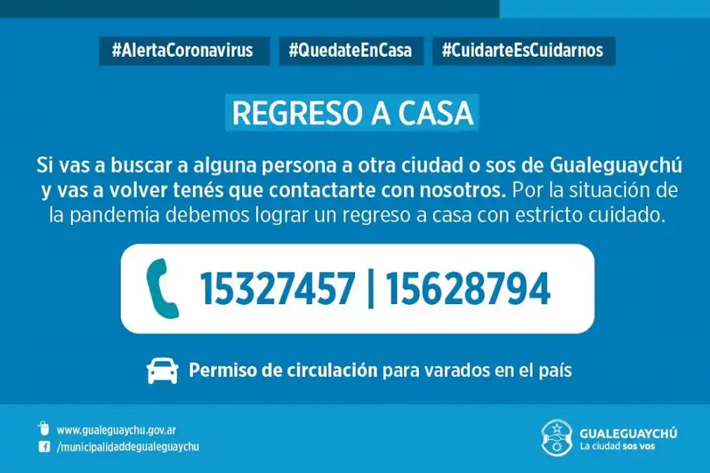 Desde la Municipalidad de Gualeguaychú se pusieron dos líneas telefónicas a disposición de aquellos vecinos de la ciudad que deban regresar a la ciudad desde algún punto del país. También tendrán que comunicarse aquellas personas que viajen para trasportar a los vecinos en su regreso a casa.
