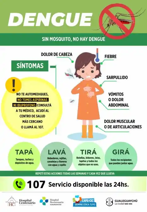 El Dengue es una de las tres entidades, junto a Covid-19 y Sarampión, que preocupa a las autoridades sanitarias de la región y es por ello que desde el Centenario han adoptado todas las medidas de prevención para contrarrestar estas enfermedades. En Gualeguaychú ya se han aplicado 32 bloqueos en distintos puntos de la ciudad, pero sin embargo se ha incrementado el número de personas infectadas por Dengue. Se contabilizan 24 los casos confirmados en el departamento, de los cuales 22 pertenecen a la ciudad cabecera. Cada vez que se presenta un caso sospechoso, se activa el protocolo preventivo para bloquear la situación en nueve cuadras a la redonda del lugar donde se ubicó un posible foco. La Municipalidad, junto a personal del hospital, ha instrumentado los bloqueos en los últimos meses para informar a los vecinos y vecinas sobre la necesidad de prevenir la proliferación de mosquitos Aedes Aegypti. El bloqueo consiste en recorrer con un equipo de trabajadoras de la salud nueve manzanas a la redonda del caso sospechoso o confirmado, promoviendo la descacharrización y ordenamientos de patios, búsqueda y derivación de personas con fiebre y sintomatología compatible con dengue, indicación de medidas preventivas y sólo se aplica la fumigación sólo si el caso es confirmado. ¿QUÉ ES EL DENGUE? Es una enfermedad viral transmitida por la picadura del mosquito Aedes Aegypti. Cuando el mosquito se alimenta con sangre de una persona enferma de dengue y luego pica a otras personas les transmite esta enfermedad. El contagio solo se produce por la picadura de los mosquitos infectados, nunca de una persona a otra, ni a través de objetos o de la leche materna. Sin embargo, aunque es poco común las mujeres embarazadas pueden contagiar a sus bebés durante el embarazo. ¿CUÁLES SON LOS SÍNTOMAS? Los síntomas asociados a la enfermedad son: fiebre; dolor de cabeza, de ojos, músculos y articulaciones; náuseas y vómitos e irritaciones en la piel. Si sufrís algunas de estas afecciones se aconseja: No consumir aspirinas, ibuprofeno y no te apliques inyecciones intramusculares Consultar a un médico lo antes posible para que te dé un diagnóstico correcto ¿CÓMO SE PUEDE PREVENIR? El mosquito crece en zonas cercanas a las viviendas y solo necesita una cantidad mínima de agua estancada y un poco de sombra para dejar sus huevos y reproducirse. Cualquier recipiente que contenga agua puede ser un criadero. Por lo tanto, debemos: Evitar tener recipientes con agua estancada Poner boca abajo cualquier recipiente que no uses Tapar los tanques de agua Realizar tareas de limpieza frecuentemente en patios y alrededores de los hogares Destapar los desagües de lluvias de los techos Mantener piletas de natación limpias y tratadas con cloro Usar repelente al menos cada tres horas sobre la ropa y en los lugares donde la piel esté descubierta Para esto es imprescindible que en este momento donde todos debemos estar en nuestra casa por la cuarentena obligatoria por el coronavirus, todos limpiemos y descacharricemos.