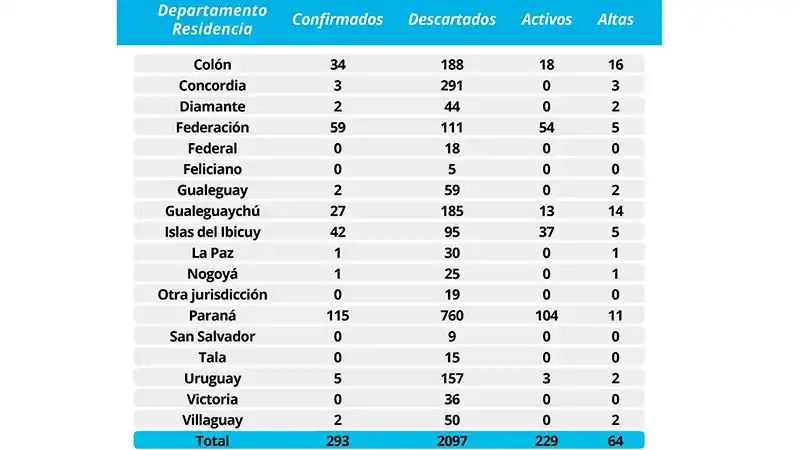 En el primer día de julio se confirmaron 10 nuevos casos de coronavirus en Entre Ríos: siete con domicilio en la ciudad de Paraná y uno en Oro Verde. También se confirmó un caso en zona rural de Villa Elisa, departamento Colón, y otro en la localidad de Crespo. En cuanto a la ciudad de Paraná, se informó que hay en promedio entre 40 y 50 casos por día sospechosos que se están estudiando. En relación al acumulado para toda la provincia, son 293 los casos que se han confirmado, de los cuales 64 pacientes han sido dados de alta.Según detalló el director de Epidemiología, Diego Garcilazo, "31 casos, el 10 por ciento del total, corresponden a personas mayores de 60 años y que el resto son todas personas entre los 20 y 40 años". Respecto a la evolución de los pacientes, especificó que la mayoría de los diagnosticados en la provincia son cuadros leves. Pero apuntó que hay tres pacientes que en este momento se encuentran en cuidados intensivos, dos de Paraná y uno de Santa Ana, este último internado en un nosocomio de Concordia. Federal, Feliciano, Victoria, Tala y San Salvador son los departamentos que no registran casos.