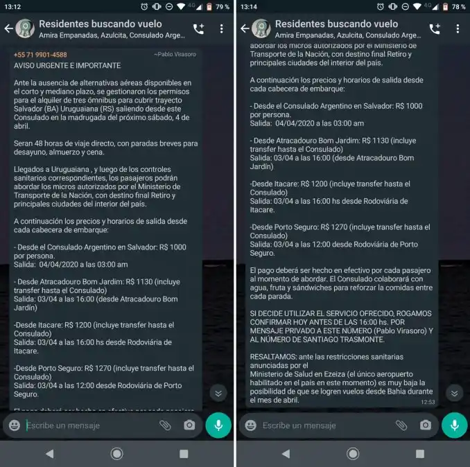 Por Rodrigo Peruzzo. Solange Reichel es una gualeguaychuense que se fue a la isla Morro de Sao Paulo Bahía el 5 de diciembre, cuando todavía el coronavirus era noticia solo en China, a trabajar como fotógrafa en los paseos de barcos sacándole fotos a los turistas. “Busqué tres meses trabajo en Argentina y no conseguí, así que decidí salir para Brasil”, aseguró. “Vivíamos de lo que ganábamos en el día, y si llovía no había paseo y era un día perdido, además la temporada estuvo floja este año”, contó la mujer de 30 años, que relató el duro momento que les toca vivir: “cuando empezó la pandemia no pudimos trabajar más, la isla vive solo del turismo. Estamos subsistiendo con ahorros pero ya se nos están acabando”. Solange explicó que no tienen manera de conseguir plata. Hay un solo cajero en la zona pero se quedó sin efectivo, y la mayoría son viajeros que no usan tarjetas, que por otra parte tienen el recargo del 30%. Además, contó que con lo poco que le queda tuvo que pagar el alquiler de $1000 reales con sus dos amigas que se encuentra conviviendo “para no quedarnos en la calle”, pese a que por decreto están prohibidos los desalojos. En total son 150 argentinos se encuentran varados en el estado de Bahía, se trata en su mayoría de personas que se encontraban trabajando durante la temporada de verano y hoy se encuentran desesperados por retornar al país y reencontrarse con sus familias. La gualeguaychuense cuenta que hay personas con hipertensión, con problemas respiratorios, mayores de 65 años y una embarazada de ocho meses que no tiene lugar dónde alojarse y se encuentra en una fábrica cerrada. Pocas respuestas del cónsul y una propuesta que enojó aún más a los varados Los argentinos, unidos a través de un grupo de WhatssApp, desde hace 20 días gestionaron la manera de volver ante Pablo Exequiel Virasoro, cónsul en Bahía, pero con escasas respuestas y con una propuesta en las últimas horas que encendió el enojo de todos. “Ante la ausencia de alternativas aéreas disponibles en el corto y mediano plazo, se gestionaron permisos para el alquiler de tres ómnibus para cubrir el trayecto Salvador (BA) Uruguaiana (RS) saliendo desde el Consulado en la madrugada del próximo sábado 4 de abril. Serán 48 hs. de viaje directo. Llegados a Uruguaiana, los pasajeros podrán abordar los micros autorizados por el Ministerio de Transporte, con destino final a Retiro”, comienza el mensaje del cónsul. “A continuación los precios”, prosigue el comunicado y derrumba la ilusión del más de centenar de miembros del grupo ‘Residentes buscando vuelo’. Los mismos van desde los 1000 reales a los 1270 reales (valores que superan los $20.000 en las casas de cambio de Bahía), y con la particularidad que “deben ser abonados en efectivo al momento de abordar”, algo que ya no hay entre la gran mayoría de los varados. Solo quince pudieron alcanzar esa cifra, pero el diplomático informó que “se canceló la propuesta por falta de interés”. La gualeguaychuense contó que averiguaron por cuenta propia, y alquilar un auto por su cuenta les saldría 100 reales, o un taxi hasta la frontera les costaría 500 reales, opciones a las que no se animan por temor a que los detengan en el camino o a quedar a la deriva, sin respuestas y expuestos al coronavirus en el aeropuerto. “Los números que nos dijo el cónsul no nos cierran, y menos que tengamos que pagarle a él en efectivo”, sentenció Solange. La angustia de los 150 argentinos sigue creciendo, inversamente proporcional a los recursos que escasean cada vez más, al igual que las respuestas de la diplomacia argentina en Brasil, el país latinoamericano más afectado por la pandemia (con más de 350 muertos y casi 10.000 contagiados) por la irresponsabilidad e inacción de Jair Bolsonaro.