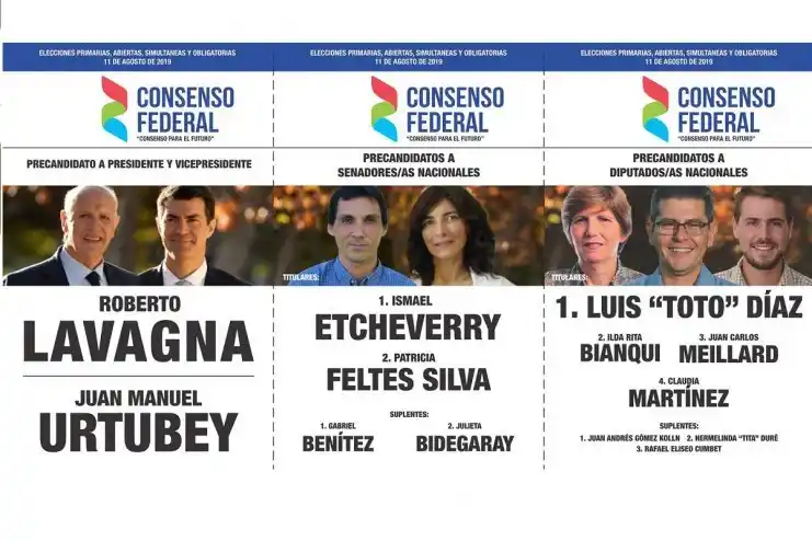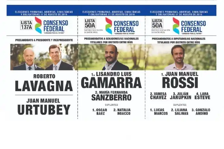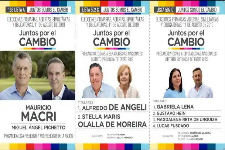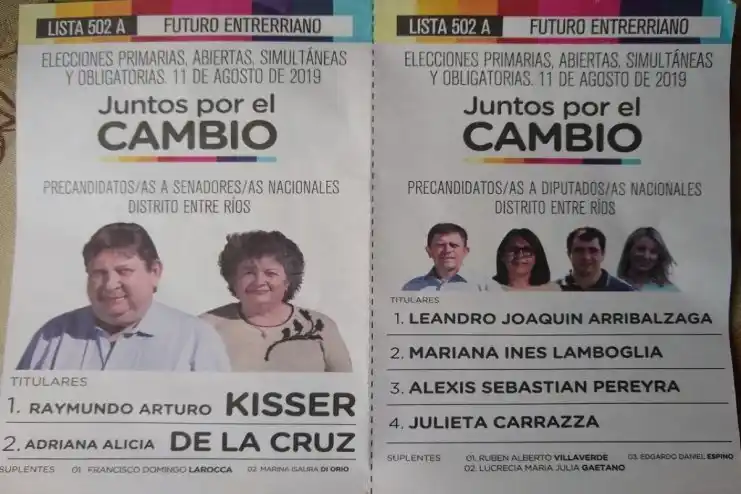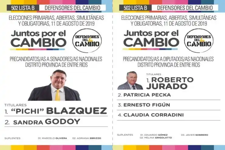 El próximo 10 de diciembre, el Congreso de la Nación renovará 130 diputados –cuatro de los nueve entrerrianos– y 24 senadores, correspondientes a ocho distritos. Pero para eso todavía falta mucho. Los precandidatos deberán sumar el 1,5 % de los votos en las primarias de la jornada de hoy para, el 27 de octubre, competir en las Generales. Con un peso del 3 % del padrón nacional, Entre Ríos elegirá en estas PASO entre los diez precandidatos presidenciales, aunque sólo cinco cuentan con lista propia en la provincia. Ellos son: Mauricio Macri (Juntos por el Cambio), Alberto Fernández (Frente de Todos), Roberto Lavagna (Consenso Federal), Nicolás del Caño (FIT Unidad) y Manuela Castañeira (MAS). Los otros cinco no tienen representación parlamentaria en Entre Ríos. Ellos son: José Luis Espert (Despertar), Juan Gómez Centurión (Frente NOS), Alejandro Biondini (Frente Patriota), José Romero Feris (Partido Autonomista) y Raúl Albarracín (Movimiento de Acción Vecinal) ¿Qué bancas se pondrán en juego en octubre? En diciembre, en la Cámara Baja nacional llegan a su fin los mandatos de los peronistas Juan Manuel Huss y Julio Solanas, y de los diputados electos por Cambiemos Yanina Gayol (PRO) Y Marcelo Monfort (UCR). Los dos primeros ya tienen asegurado una banca: serán diputados provinciales, puesto que fueron elegidos en las elecciones provinciales del pasado 9 de junio. En el Senado de la Nación, en tanto, culmina el mandato Alfredo De Angeli (PRO), quien encabeza la “lista oficial” de Juntos por el Cambio y busca seis años más en la Cámara Alta, y los peronistas Pedro Guastavino y Sigrid Kunath. Todas las opciones del cuarto oscuro Juntos por el Cambio Alineados a la precandidatura presidencial de Mauricio Macri, el oficialismo nacional va dividido en Entre Ríos, donde presentará tres opciones: Lista “Juntos somos el Cambio” Senado: 1) Alfredo De Ángeli. Senador nacional que busca la reelección. 2) Stella Olalla. Dirigente radical de la Corriente Illía, sector cuyo referente es Atilio Benedetti. Diputados: 1) Gabriela Lena. Dirigente radical oriunda de Chajarí y diputada provincial. 2) Gustavo Hein. Presidente del PRO provincial. Intendente de Basavilbaso y excandidato a vicegobernador en fórmula con Atilio Benedetti. Lista “Futuro Entrerriano” Senado: 1) Raymundo Kisser. Dirigente radical y senador provincial por el departamento Paraná. 2) Adriana De La Cruz. Exconvencional constituyente de la provincia. Dirigente de la Coalición Cívica. Diputados: 1) Leandro Arribalzaga. Intendente radical de Villa Elisa y actual presidente de la UCR de Entre Ríos. 2) Mariana Lamboglia. Dirigente radical de La Paz. Lista “Defensores del Cambio” Senado: 1) Hernán “Pichi” Blázquez. Empresario del espectáculo. Diputados: 1) Roberto Jurado. Dirigente de Gualeguaychú. “Frente de Todos” – Sostiene la precandidatura presidencial de Alberto Fernández Senado: 1) Edgardo Kueider. Secretario General de la Gobernación. 2) Stefania Cora. Actual concejal de Paraná y referente de La Cámpora. Diputados: 1) Marcelo Casaretto. Presidente del IAPV y ex ministro de Economía entrerriano 2) Blanca Osuna. Exintendente de Paraná y senadora nacional. 3) Aldo Ballestena. Actual senador provincial por el departamento La Paz. 4) María Elena Tassistro. Diputada provincial vinculada al massismo Consenso Federal – Alineados a la candidatura presidencial de Roberto Lavagna Senado: 1) Lisandro Gamarra. Dirigente de Gualeguaychú y referente del partido Ser. 2) Fernanda Sanzberro. Dirigente del Partido Socialista Diputados: 1) Juan Manuel Rossi. Dirigente de la conducción del Partido Socialista 2) Vanesa Chavez. Dirigente de la Confederación Vecinalista 3) Julián Jarupkin dirigente de Barrios de Pie y de Libres del Sur Lista “Consenso Federal” Senado: 1) Ismael Etcheverry. Dirigente de Gualeguay 2) Silvia Feltes Diputados: 1) Luis Eduardo Díaz. Concejal del Frente Renovador Paraná 2) Ilda Rita Bianqui (UCR) 3) Juan Carlos Meillard Frente de Izquierda y de los Trabajadores – FIT Unidad – Su candidato a Presidente es Nicolás del Caño Senado: 1) Nadia Burgos. Trabajadora estatal. Dirigente del MST Paraná y excandidata a diputada provincial. 2) Gabriel Geist. Dirigente del MST oriundo de Crespo. Diputados: 1) Luis Meiners. Dirigente del MST y ex candidato a gobernador. 2) Alejandra Riquelme. Dirigente del MST de Concordia. MAS - Su candidata a presidente es Manuela Castañeira Senado: 1) Luis Antonio Rojas 2) Claudia Verónica Rojas Diputados: 1) Federico Demarchi 2) Marta Isabel Núñez 3) Facundo Miguel Rojas El resto de los precandidatos Partido: Despertar Precandidato a Presidente de la Nación: José Luis Espert Frente NOS Precandidato a Presidente de la Nación: Juan Gómez Centurión Frente Patriota Precandidato a Presidente de la Nación: Alejandro Biondini Partido Autonomista Precandidato a Presidente de la Nación: José Romero Feris Movimiento de Acción Vecinal Precandidato a Presidente de la Nación: Raúl Albarracín