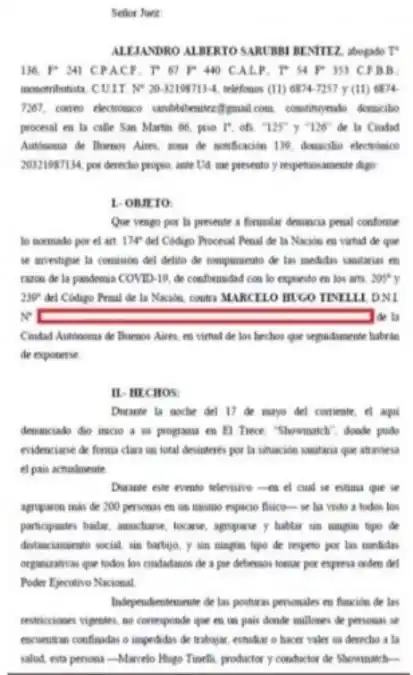 Marcelo Tinelli se encuentra en el ojo de la tormenta, tras su tan esperado regreso a la pantalla de canal Trece. Con un promedio de 20 puntos de rating, ShowMatch le disputó mano mano el rating a MasterChef y logró equiparar la pelea en términos de audiencia con el canal vecino, teniendo en cuenta que el canal de Constitución llevaba más de 40 meses segundo, detrás de la señal de las pelotas. Pero el regreso del "cabezón" estuvo marcado por el escándalo, debido a la evidente ausencia de protocolos sanitarios durante el mega show que contó con más de 200 figuras presentes en el estudio. De hecho, gran parte de los presentes no respetó el uso de barbijos o el distanciamiento social que busca evitar el contagio masivo en este contexto de pandemia mundial. Sin ir más lejos, este martes el conductor recibió una denuncia por no respetar las medidas de distanciamiento social reguladas en el marco de la emergencia del coronavirus. En el escrito le exigen a la Justicia que investigue al empresario y que se le apliquen las sanciones penales correspondientes por la presunta “comisión del delito del rompimiento de medidas de sanitarias en razón de la pandemia del Covid-19”. La presentación estuvo a cargo del abogado Alberto Alejandro Sarubbi Benítez, quien indicó que durante la transmisión del ciclo “pudo evidenciarse de forma clara un total desinterés por la situación que atraviesa el país actualmente”. “Se ha visto a todos los participantes bailar, amucharse, tocarse, agruparse y hablar sin barbijo y sin ningún tipo de respeto por las medidas que todos los ciudadanos de pie debemos tomar por expresa orden del Poder Ejecutivo Nacional”, reza la denuncia. Si bien el propio Tinelli dejó en claro a lo largo de la emisión que todos los integrantes del programa fueron previamente hisopados en más de una oportunidad, el letrado sumó: “No corresponde que en un país donde millones de personas se encuentran confinadas o impedidas de trabajar, estudiar o hacer valer su derecho a la salud, Marcelo Tinelli ejecute eventos con total impunidad y desinterés por lo que vive el resto de los habitantes de la Nación”. La información fue dada a conocer esta tarde en Intrusos, ciclo que conducen Adrián Pallares y Rodrigo Lussich. "Esto es en un contexto peor, el año pasado Tinelli no hizo televisión porque no podía hacer esto que es la esencia de su programa, su ADN. La pregunta es, ¿puede hoy? ¿Están dadas las cuestiones sanitarias para que haga esto que el año pasado lógicamente no podía hacer? ¿Ahora?", lanzó Lussich. Al mismo tiempo, el creador de los "Escándalones" se preguntó si este es un escenario propicio para que Tinelli haga su programa y agregó: "El tema es por qué sí Tinelli y no el resto de la industria que necesita laburar". Mientras que Pallares fue por más y disparó, minutos antes de leer al aire el fuerte posteo de Gustavo Sofovich: "Uno trata de preservar las burbujas, y acá hay muchas burbujas juntas". El hijo de Gerardo explotó de furia al terminar de ver el regreso de Tinelli a la pantalla chica. "ExpoCovid 2021. Estoy hablando de lo que pasó ayer en nuestra querida y golpeada televisión. Hablo de lo que sucedió en un país donde hay 500 muertos por día, en el que a diario cierran sus puertas comercios y restaurantes, donde debatimos si los colegios deben o no estar abiertos , en el que miles de personas pierden sus trabajos, y en el que hoy se debate aplicar restricciones aún más estrictas (…) No se justifica semejante desatino con sentidas palabras, saludos con choques de puños, ni con un justo homenaje a los médicos, lo repito: en un lugar cerrado con 200 personas adentro", lanzó el productor.