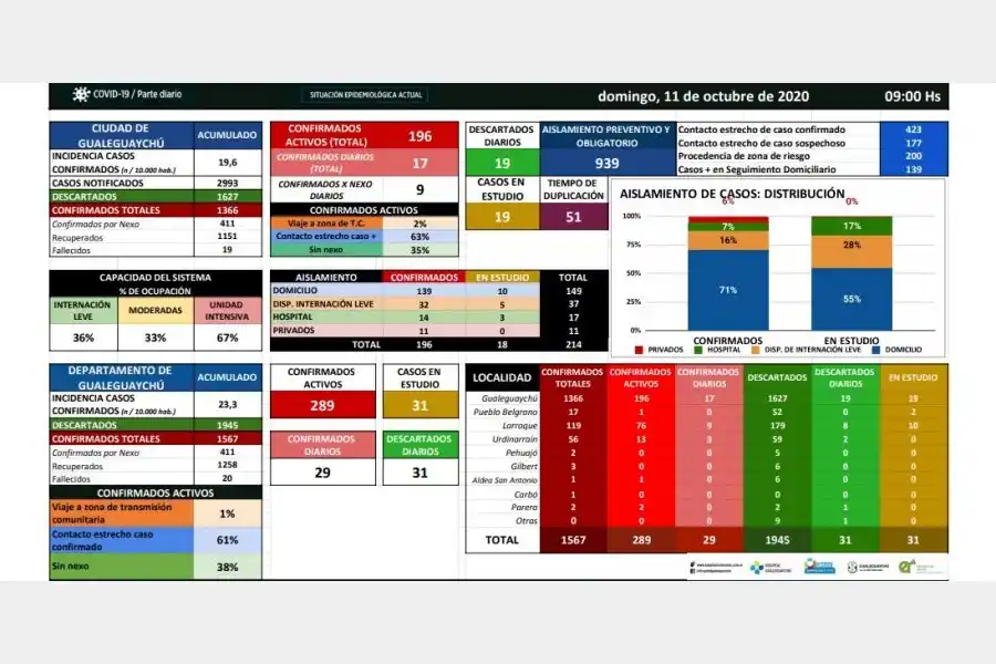 El informe enviado por el Hospital Centenario indicó que de los nuevos casos confirmados, 17 corresponden a la ciudad de Gualeguaychú, 9 a Larroque y 3 a Urdinarrain, totalizando 1567 los casos confirmados en el Departamento. Actualmente, un total de 289 casos permanecen activos, 196 de ellos se dan en la ciudad, 76 en Larroque, 13 en Urdinarrain, 2 en Parera, 1 en Pueblo Belgrano y 1 en Aldea San Antonio. Además, hay 31 casos en estudio, 19 en Gualeguaychú, 10 en Larroque y 2 en Urdinarrain. El tiempo de duplicación de casos es de 51 días y son 939 las personas bajo seguimiento. El porcentaje de camas de internación ocupadas, es del 36% en internación leve, 33% en internación moderada y 67% en unidades de Terapia Intensiva.