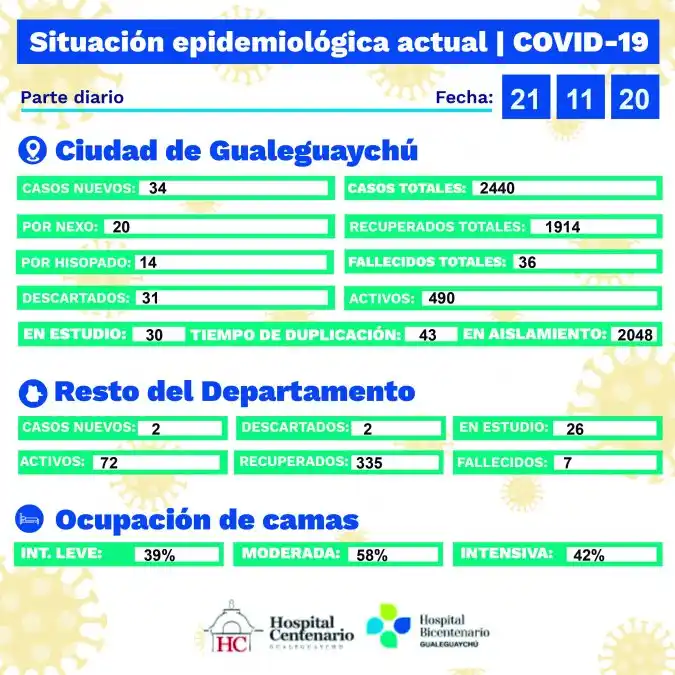El Nodo epidemiológico del Hospital Centenario reportó 34 nuevos contagios de Covid-19 en la ciudad de Gualeguaychú, de los cuales 20 fueron confirmados por nexo epidemiológico y 14 por hisopado positivo. Se descartaron 31 muestras. Además, se detectaron 2 casos positivos en Urdinarrain. De los 2854 contagiados desde el inicio de la pandemia en el departamento, 2249 ya se recuperaron, 562 continúan cursando la enfermedad y 43 fallecieron. Hay 56 casos en estudio en el departamento y el tiempo de duplicación de casos es de 43 días. Capacidad del sistema sanitario La ocupación en unidades de terapia intensiva es del 42%, en internación moderada es del 58%, y en internación leve es del 39%. Las personas en aislamiento preventivo y obligatorio son 2048.