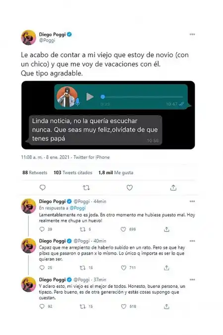 Diego Poggi, el periodista de Todo Noticias especializado en tecnología, vivió una desagradable situación familiar y decidió hacerla pública. Muy activo en las redes sociales y con un particular código e intercambio con sus seguidores, este viernes por la mañana utilizó su cuenta de Twitter para contar un diálogo con su padre. Diego mostró una captura de pantalla de su celular en la que se veía una conversación vía WhatsApp con su papá. Desde su teléfono, partía un mensaje de audio, que el joven tradujo por escrito: “Le acabo de contar a mi viejo que estoy de novio (con un chico) y que me voy de vacaciones con él. Que tipo agradable”, señaló el periodista de TN. De inmediato, se supo que lo de agradable no era más que una ironía, ya que lo que le contestaba su padre estaba precisamente en las antípodas: “Linda noticia, no la quería escuchar nunca. Que seas muy feliz, olvidate de que tenés papá”, fue la dura respuesta con la que se encontró el conductor.  El diálogo de Diego Poggi con su padre que se hizo viral El joven completó la captura con un hilo de mensajes en los que contaba cómo había tomado las palabras de su padre. “Lamentablemente no es joda. En otro momento me hubiese puesto mal. Hoy realmente me chupa un huevo!”, señaló Poggi, quien a continuación dejó otro mensaje explicando por qué decidía hacerlo público: “Capaz que me arrepiento de haberlo subido en un rato. Pero sé que hay pibxs que pasaron o pasan por lo mismo. Lo único que importa es ser lo que quieran ser”. De inmediato, la publicación se viralizó y el periodista empezó a recibir numerosas muestras de apoyo. “Qué bueno soltar y mostrarlo para que otros también puedan”, le escribió una usuaria, entre tantos mensajes en el mismo sentido: “Solo lo subí por eso, sé que hay mil pibes en mi lugar. Capaz que con esto los puedo ayudar”, apuntó Diego. Algunos comentarios cuestionaban duramente la reacción del padre, mientras otros intentaban comprender que había una cuestión generacional de por medio. “Diego, te Felicito por la VALENTÍA que tuviste. A Papá ya se le va a pasar, comprenderlo él es de otra generación”, escribió una seguidora. “Ojalá se arrepienta él de esa contestación y que puedan recomponer relación, si es que así lo querés”, le deseó otra. En este sentido, Diego se permitió una reflexión y a pesar del exabrupto, tuvo unas palabras afectivas para su padre: “Y aclaro esto, mi viejo es el mejor de todos. Honesto, buena persona, un tipazo. Pero bueno, es de otra generación y estás cosas supongo que cuestan”, analizó el periodista de TN. La repercusión de sus mensajes continuó en crecimiento y Poggi publicó un nuevo mensaje de agradecimiento, acompañado por un corazón. En tanto, en su cuenta de Instagram compartió unas emotivas palabras con sus seguidores. “Qué hacen, cómo están?”, saludó Diego con un gesto entre sorprendido y aliviado, que remató con un “¡Qué viernes, eh!”, en clara referencia al revuelo que había causado su publicación en la red del pajarito. En la siguiente historia, el conductor de Take away por Radio Berlín fue más explícito y se dirigió a propios y extraños. “A todos los que me mandaron mensajes, estoy bien, gracias por preocuparse”, aclaró el periodista levantando su pulgar derecho. “A todos los que están en la misma, los abrazo. Y si no sabés de qué estoy hablando, mucho mejor, porque no es importante”, agregó. Finalmente, Poggi subió una fotografía a Instagram para dejar en claro su postura y transmitir un mensaje esperanzador a sus seguidores. “Está todo bien y va a estar mucho mejor. Hablen, no se guarden nada y sean felices”, aconsejó. Enseguida, se sucedieron palabras de aliento y buenos deseos. Mimos para el alma, después de un viernes agitado.