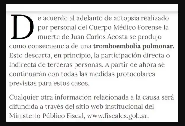 Con los resultados de la primera autopsia en su poder, Ángel de Brito informó la causa del fallecimiento de Acosta, en Los Ángeles de la Mañana. "Acá están los resultados de la autopsia. De acuerdo al adelanto de la autopsia realizada por el personal del Cuerpo Médico Forense, la muerte de Juan Carlos Acosta se produjo como consecuencia de una tromboembolia pulmonar. Esto descarta, en principio, la participación directa o indirecta de terceras personas. A partir de ahora se continuará con todas las medidas protocolares previstas para estos casos", leyó el conductor. Luego dio más detalles del caso: "Los amigos de Juan Carlos nos cuentan que e cuerpo va a quedar a disposición de la Justicia durante seis meses para investigar el origen de este suceso. Y que también va a haber una segunda autopsia para determinar si había alguna sustancia, que se le pudo haber administrado la noche del domingo, que es una de las sospechas".
