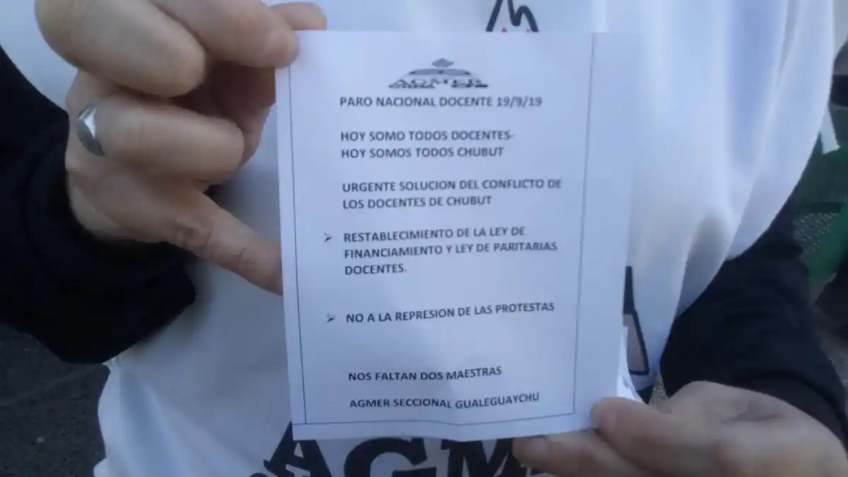 Un nuevo paro nacional docente está teniendo lugar en todo el país por  la muerte de las dos maestras de Chubut. Las maestras fallecieron en un accidente en la Ruta 3 cuando regresaban desde Rawson hacia Comodoro Rivadavia tras participar de un plenario y una movilización en reclamo de salarios adeudados. Las víctimas fueron identificadas como Jorgelina Ruíz Díaz y María Cristina Aguilar, ambas docentes de la escuela secundaria 738 de Comodoro Rivadavia. Una de ellas falleció en el acto y la otra, camino al hospital.  “Estamos acá en memoria de las maestras que murieron en Chubut que volvían de reclamar por su derecho al trabajo, al poder cobrar su sueldo, derechos que tenemos todos. Hoy estamos unidos todos los docentes a nivel país justamente para recordarlos y para pedir el compromiso del Estado, para el cual evidentemente los docentes no existimos”, afirmó Leticia Valenzuela, Secretaria Adjunta de AGMER, quien además enfatizó: “Nunca más un docente debería morir por reclamar sus derechos. Estamos unidos para visibilizar este flagelo, para mostrarle a la gente que los docentes estamos más unidos que nunca en el dolor”. “Es lamentable y es un dolor enorme lo que ha pasado, y también lo que está pasando en Chubut. Dos compañeras que deberían haber estado con su familia y no en la calle luchando murieron. Es una irresponsabilidad absoluta por parte del Gobierno de Chubut y del Gobierno nacional, que no habilitó las paritarias nacionales, algo que se derogó en 2017”, afirmó por su parte Diego Sánchez, titular de la CTA Gualeguaychú.  Finalmente, Oscar Avila, Secretario General de AGMER Gualeguaychú, afirmó que “estamos en la calle como cada vez que algo le pasa a un compañero en cualquier lugar del país, y lo que pasó en Chubut enluta nuestro colectivo docente”, quien además informó que el nivel de acatamiento al paro en el departamento de Gualeguaychú fue de alrededor del 85%. La medida de fuerza de este jueves es la segunda a nivel nacional convocada por Ctera por el conflicto en Chubut. Dos semanas atrás, el gremio también definió una medida a raíz de las agresiones que habían sufrido los maestros. Mientras cortaban la ruta, denuncian que una patota vinculada al sindicato de petroleros los atacó. En tanto, el sindicato de los maestros privados (Sadop) decidió plegarse al paro convocado por Ctera. Más allá de que el acatamiento en los colegios privados suele ser bajo, estiman que se puede llegar a sentir en algunos establecimientos.