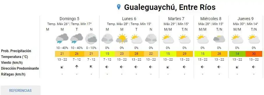 Aunque no se anuncian lluvias de importancia en Entre Ríos, en algunas zonas de la provincia la inestabilidad y las nubes serán protagonistas durante este domingo, según el pronóstico del Servicio Meteorológico Nacional. Será sobre todo en el sur y el este entrerriano, para donde se anticipa la probabilidad de algunas precipitaciones aisladas. Esto daría lugar a que en esos sectores las temperaturas no lleguen a los 30 grados. Mientras tanto, en el resto de la provincia, se anticipa una jornada con nubosidad. La tarde se presentará cálida con registros térmicos que alcanzarían o superarían los 30 grados, como el caso de Paraná. En tanto, el alto porcentual de humedad hará que las sensaciones térmicas sean mayores. Se estiman en unos 34 grados. Para el resto de la semana, tampoco se prevén lluvias y pronostican máximas que rondarían los 32 grados.