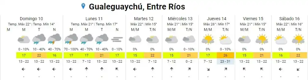 El domingo amaneció nublado y con algo de viento en Gualeguaychú, con probabilidad de lluvias aisladas hacia la tarde y de tormentas aisladas para la noche, con vientos del este y una temperatura de 13 grados de mínima y 22 grados de máxima, se acuerdo a lo informado por el Servicio Meteorológico Nacional. Para este lunes, último día del fin de semana extra largo, se esperan tormentas aisladas para la madrugada y cielo nublado a parcialmente nublado con una temperatura de entre 17 y 22 grados. En tanto, el martes se prevé cielo parcialmente nublado a mayormente nublado y una temperatura estimada en 16 grados de mínima y 23 grados de máxima.