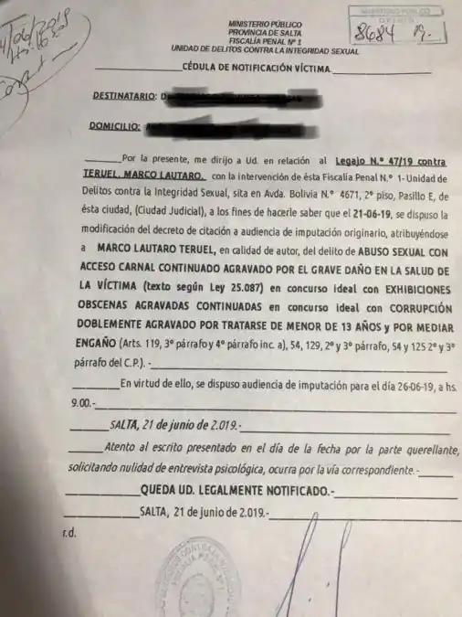 La situación judicial de Lautaro Teruel, el hijo de 27 años de Mario Teruel, por ahora ex integrante de Los Nocheros, se agravó este martes a partir de la decisión del fiscal Sergio Federico Obeid de ampliar la acusación con nuevos delitos que le serán comunicados al también músico en una nueva audiencia de imputación que se realizará mañana en el Ministerio Público Fiscal de Salta. Ahora, Marcos Lautaro Teruel, quien se encuentra bajo prisión preventiva, debe afrontar la acusación, en calidad de autor, "de los delitos de abuso sexual con acceso carnal continuado agravado por el grave daño en la salud de la víctima, según la ley 25.087, en concurso ideal con exhibiciones obscenas agravadas continuadas en concurso ideal, con corrupción doblemente agravada por tratarse de menor de 13 años y por mediar engaño". Hasta el momento, el joven estaba acusado sólo por "de exhibiciones obscenas agravadas y abuso sexual con acceso carnal", imputación que fue agravada "teniendo en cuenta que los hechos investigados resultan diversos y más complejos que los hechos por los cuales se decretó la primera citación a audiencia de imputación", según informó el Ministerio Público Fiscal de Salta. De acuerdo a lo que explicaron allegados a la causa, con la nueva calificación la condena "puede llegar hasta los 25 años" y "de cualquier manera la acusación es no excarcelable". Lautaro fue denunciado en abril por la madre de una adolescente, actualmente de 17 años, que lo acusó de abusar sexualmente en reiteradas oportunidades de su hija cuando ella tenía solo 10 años. En este caso el acusado aprovechó que la niña frecuentaba su casa para “violarla en reiteradas oportunidades. La audiencia está prevista para este miércoles, a las 9, en la Fiscalía Penal 1 de la Unidad de Delitos contra la Integridad Sexual que está llevando adelante la instrucción de la causa. Cabe recordar que Lautaro Teruel se encuentra detenido en la Alcaidía General de Salta. El hijo del Nochero afronta una segunda causa por abuso sexual que fue radicada semanas atrás por una mujer de 24 años que tenía 19 al momento de los hechos denunciados. "La citación es por la primera denuncia y no están acumuladas las causas, que se unificarían cuando pida elevación a juicio y eso todavía no pasa", explicaron las fuentes cercanas al expediente. La última acusación judicial es de una mujer que asegura haber sido abusada por el joven cuando ella tenía 19 años, en la casa del músico. Según consta en la denuncia, la mujer se encontró con Teruel, Farfán y un tercero -amigo de ellos- en un local nocturno. Desde allí, los cuatro se trasladaron a una fiesta en un domicilio particular y luego a un bar donde estuvieron poco tiempo. Ya en el domicilio de Teruel, la víctima relató que se encontraba en una habitación manteniendo relaciones sexuales consentidas con el tercero de los presentes, cuando imprevistamente ingresó Teruel y la penetró. El hombre con quien mantenía el encuentro sexual consentido, se retiró de la habitación y posteriormente lo hizo Teruel. La denunciante se encontraba todavía en estado de shock, cuando ingresó Farfán totalmente desnudo y, al ver el estado de la mujer, se retiró. A principios de junio, el fiscal penal de Delitos contra la Integridad Sexual N°1, Sergio Federico Obeid, supervisó el allanamiento en la casa del músico y trascendió que los efectivos de seguridad encontraron algunas plantas de marihuana que pertenecerían al cantante de Los Nocheros. Las plantas estaban en una habitación con varias macetas, un extractor de aire, lámparas, fertilizantes y ramas en proceso de secado. Ante el hallazgo casual, intervino en ese momento el fiscal de la Ufinar (Unidad Fiscal contra la Narcocriminalidad), Santiago López Soto, quien se declaró incompetente en esta causa. De esta manera, en las últimas horas, el juez de Garantías N° 2, Ignacio Colombo, hizo lugar al pedido de López Soto y declaró la incompetencia material en la causa. El juez Colombo entendió que “de la simple lectura de la ley, se advierte la explicita exclusión legislativa de la posibilidad para la justicia provincial”, de entender en la causa. Y citó la regla de hermenéutica dirimente de la competencia, que establece en la Ley 26052 que “en caso de dudas sobre la competencia, prevalecerá la justicia federal”. En su resolución, el juez Colombo también dispuso la remisión del Legajo de Investigación Fiscal del Grupo de Drogas Ufinar, al Juzgado Federal que por turno corresponda. Y ordenó que los bienes secuestrados en el marco de la causa, queden a disposición de la Justicia Federal. En el escrito dirigido al juez de Garantías, López Soto expresó lo siguiente: "En virtud de lo dispuesto por los artículos 241 y 242 del Código Penal, la unidad sostiene su incompetencia para continuar interviniendo en la investigación". Agrega: "Al haberse dado intervención al juzgado en cuestión, corresponde declarar la incompetencia material y que las actuaciones se remitan a la Justicia Federal". En su presentación el fiscal de la Unifar señaló que "de los elementos obrantes en la causa surge que el accionar del imputado (Mario Teruel) encuadra, prima facie, en el delito previsto en el artículo 5, inciso A de la ley 23.737 (cultivo de estupefacientes)". En esa línea, explicó que al no formar parte de los delitos llamados desfederalizados de la ley 26.052, conforme acordada 11554/2013, la investigación "debe continuar bajo la órbita de la Justicia Federal". Además, detalló que en la casa de Teruel se encontraron "fertilizantes, lámparas con plafón y rociador, sumado a la cantidad de plantas de cannabis sativa halladas". Y en este marco, precisó que el volumen de lo incautado "excede una cantidad que razonablemente pueda atribuirse al consumo personal".