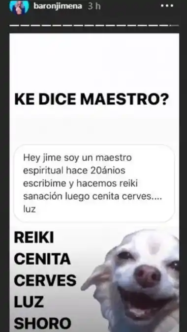 Fiel a su estilo, Jimena Barón mostró un insólito mensaje que le envió un usuario de Instagram, donde la invitaba a salir de una manera muy llamativa. "Hey jime soy un maestro espiritual hace 20 años, escribime y hacemos reiki, sanación y luego cenita y cerveza, luz", dice la invitación mal escrita que le hizo el hombre a la cantante. Y por supuesto, Jimena subió una captura de sus palabras y comentó divertida: "¿Qué dice maestro?, reiki, cenita, cerveza, luz, lloro".