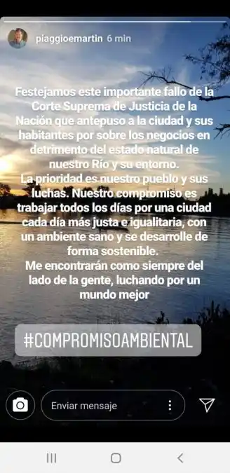 El intendente Martín Piaggio fue contundente al opinar sobre el fallo que condena el avance del barrio náutico sobre un humedal. En una historia de Instagram dejó un fuerte testimonio: "Festejamos este importante fallo de la Corte Suprema de Justicia de la Nación que antepuso a la ciudad y sus habitantes por sobre los negocios". El descargo se da a horas de haberse conocido el fallo que reconoce como válido el reclamo de un grupo de ambientalistas de la ciudad, encabezados por el abogado JUlio Majul. El texto completo