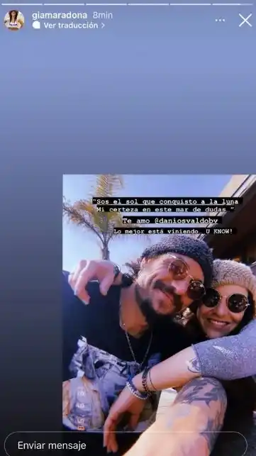 Muy enamorada, Gianinna Maradona volvió a dedicarle su inmenso amor a su novio, Daniel Osvaldo, con un llamativo ¡y meloso! mensaje al que coronó con una selfie en la que se los ve súper cómplices. La hija del Diez compartió a través de sus stories de Instagram una foto al aire libre que la muestra súper sonriente junto al ex de Jimena Barón, abrazados y mirando hacia la cámara con mucha ternura. "Sos el sol que conquistó a la luna, mi certeza en este mar de dudas. Te amo, Daniel. Lo mejor está viniendo... ¡Vos sabés!", expresó sembrando el misterio y mostrándose muy enamorada luego de que admitiera que él es celoso