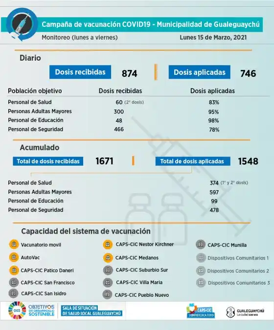 Tras los cuestionamientos de la oposición días atrás por la campaña de vacunación contra el coronavirus llevada a cabo por el municipio a los empleados de la Secretaría de Desarrollo Social y Salud, desde la Municipalidad difundieron este lunes la puesta en marcha de un monitoreo. "Ponemos a disposición una herramienta para que la ciudadanía acceda a la información del estado de la campaña de vacunación covid-19 aportando los datos del trabajo desarrollado por el municipio", anunciaron desde el gobierno local. Explicaron que "la capacidad del sistema refiere a la cantidad de dispositivos de vacunación activos/disponibles al momento de la presentación diaria. En este caso se cuenta con 14 dispositivos, 5 activos, 9 disponibles". También señalaron que los datos corresponden a la vacunación en los efectores municipales, y recordaron que "la cantidad de dosis recibidas, la población objetivo (adultos mayores, seguridad, educación, salud, bomberos, etc.) y la nómina de a quién corresponden la confecciona, en base a los criterios plan rector provincial, el Ministerio de Salud de Entre Ríos". "Al día de la fecha, no contamos con la información del total de dosis aplicadas en la ciudad, el departamento y la provincia", concluyeron. Los datos Según el monitoreo difundido este lunes, la municipalidad ya aplicó el 92,6% de las dosis que recibió, 1548 de 1671 disponibles. Ya han sido vacunados en los efectores municipales 374 trabajadores de Salud, 597 adultos mayores, 99 de personal de Educación y 478 trabajadores de Seguridad. Además, se informó que este lunes recibieron 874 dosis y aplicaron 746.