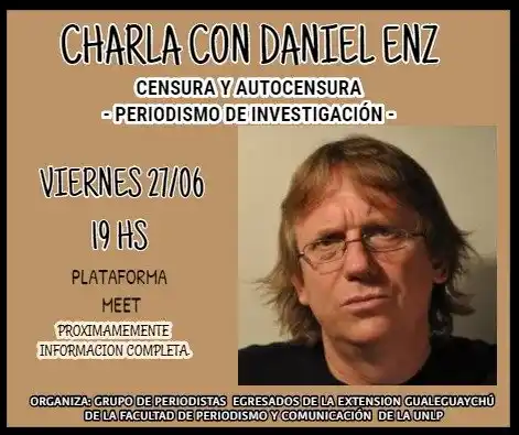 Será la primera de una serie de charlas que tendrá la organización de los periodistas egresados de la Extensión Gualeguaychú de la UNLP, las cuales son abiertas a todo público y se podrá acceder a las mismas a través de la plataforma Google Meet, previo registro de inscripción. El temario que abordará Daniel Enz en su charla será Censura y Autocensura periodística, Periodismo de investigación y Colegiación: su importancia, además de algunos otros temas de actualidad y también responderá a las preguntas de los participantes de la charla. La cita será el viernes próximo desde las 19, solicitándose a los interesados en participar de la misma, completar el siguiente formulario https://forms.gle/kfWxCf9B3hhMs47x8 simplemente para tener un registro de los participantes. Desde la organización se indicó que la charla comenzará de manera puntual a las 19, por lo que se solicita a los participantes ingresar a la plataforma con 10 minutos de anticipación.