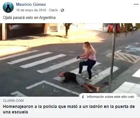 En mayo de 2018, en Brasil, Katia da Silva Sastre, una oficial de la Policía de San Pablo, mató a un delincuente cuando vio que quería robarle a un grupo de madres que estaba en la puerta de un colegio. Esta mujer de 42 años, le pegó tres tiros en el pecho al ladrón y todo quedó registrado en un video que recorrió el mundo. El video muestra el momento en que, cuando los invitados al acto por el día de las madres, en un colegio privado de Suzano, en el municipio en el estado de Sao Paulo, esperaban por la apertura de las puertas de la escuela, un hombre armado se aproximó, apuntó su revólver contra algunas de las mujeres e intentó robarles sus pertenencias. En ese momento, Katia Sastre, que vestía de civil, no dejó reaccionar al ladrón y le disparó. Días después fue homenajeada por el gobernador de San Pablo, Marcio Franca, y esto trascendió en los diferentes medios que habían dado a conocer la noticia. El caso es muy distinto a lo sucedido el miércoles en Gualeguaychú, pero Mauricio Gómez, el acusado de haber disparado a Iván Pérez, se hizo eco de lo sucedido en tierras cariocas y republicó en su muro de Facebook la noticia con un singular posteo. “Ojalá pasará esto en Argentina”, escribió el funcionario policial en referencia al homenaje que recibió Katia da Silva Sastre por parte de las autoridades políticas de San Pablo. El hombre que se encuentra cumpliendo una prisión preventiva por 35 días e imputado de homicidio agravado, por lo cual podría ser condenado a prisión perpetua, no dudó en desenfundar su arma y dispararle a Pérez, emulando a la oficial brasilera, cuando en realidad el hecho sucedido en Gualeguaychú no tiene nada en común.