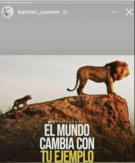 Desde el 20 de enero, Carmen Barbieri está internada en la clínica Zabala, en Belgrano, haciéndole frente al coronavirus. ¿Por qué decidieron ingresarla? La enfermedad le provocó un cuadro de neumonía bilateral que debía ser atendido con rapidez. La salud de la capocómica pasó por varias etapas hasta llegar al coma farmacológico, al que había sido inducida para poder ser intubada y recibir oxígeno de manera mecánica. Sin embargo, la semana pasada los médicos la despertaron y Carmen ya empezó a respirar por sus propios medios. Mientras Fede celebra que la salud de su mamá está mejorando, ella se muestra positiva a través de sus redes sociales. Mediante sus stories de Instagram, compartió una significativa frase motivacional que deja en evidencia su fortaleza. "El mundo cambia con tu ejemplo, no con tu opinión", expresa la imagen.