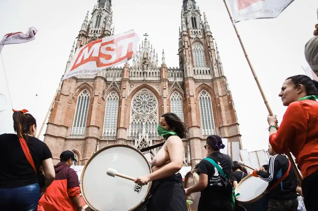 La Catedral de La Plata, una de las más grandes del mundo, había pasado desapercibida en este Encuentro Nacional de Mujeres. Todas las actividades se organizaron alejadas del máximo símbolo de la Iglesia, sin embargo este domingo el agua de las fuentes de su plaza amaneció teñida de verde, el color del reclamo por el aborto legal. Al mediodía la intervención artística se convirtió en “un tetazo” organizado por los movimientos de izquierda. Decenas de torsos “en cuero” con consignas sobre la soberanía de los cuerpos bailaron y cantaron frente a un vallado. Del otro lado de las rejas, una fila de cien mujeres policías protegían el edificio neogótico frente a Plaza Moreno. “Dicen que somos zurdas y asesinas, los fachos que apoyaron a genocidas. Dicen que quieren salvar a las dos vidas, los que cubren a curas por pedofilia”, cantaron. Milagros tiene 23 años, llegó el Encuentro desde Santa Fe y explicó por qué vino a reclamar la separación de la Iglesia del Estado. “Fui durante 15 años a una escuela católica. Soy lesbiana, así que viví siempre de cerca esa opresión”. “Es una institución retrógrada y el Estado le destina millones de pesos de nuestros impuestos para sus iglesias y sus colegios. Es la institución que se opuso a un montón de nuestros derechos: el voto femenino, la ley de divorcio, la ley de matrimonio igualitario, la ley de identidad de género y ahora el derecho al aborto legal”, opinó. El “tetazo” fue organizado por “Juntas y a la Izquierda” y el MST porque, desde hace varios años, la organización del Encuentro Nacional de Mujeres evita que la marcha pase por las iglesias y catedrales de las ciudades en las que se realiza. Este año no fue la excepción. El movimiento de izquierda, entonces, considera que el reclamo de separación de la Iglesia y el Estado se desdibuja en las discusiones políticas que se dan en el ENM. Por la tarde, desde las 18:30, se hará la marcha de cierre y estos mismos sectores se desviarán del recorrido para pasar por la Catedral. “Hace años que la organización se niega a pasar por acá cuando esta institución es enemiga de nuestros derechos”, dijo a Infobae Celeste Fierro, del MST, y agregó: “Queda claro quiénes cuidan a estos sectores: la policía”. Los pañuelos verdes –un símbolo del reclamo por el aborto legal, seguro y gratuito– y los pañuelos naranjas –que piden la separación de la iglesia y el Estado– volaban con el viento platense, bienvenido en la ciudad de las diagonales después de la feroz tormenta de ayer.