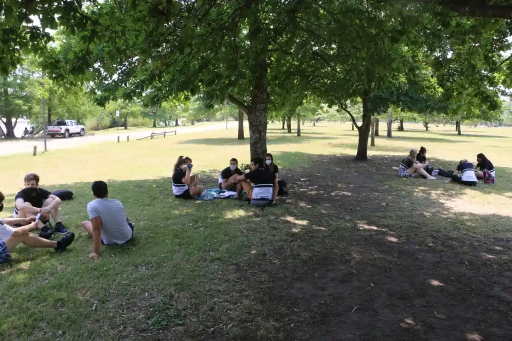 Alumnos y alumnas de sexto año de Economía de la Villa Malvina decidieron tener las clases virtuales de Matemática juntos en el Parque Unzue. Fue bajo la sombra de unos árboles, teniendo en cuenta la elevada temperatura registrada esta mañana, en tres grupos de cuatro alumnos que guardaron la distancia social que se aconseja para evitar el contagio del coronavirus. Cada chico con su celular y material de estudio siguió la clase del profesor en forma mucho más distendida que solos y encerrados en su domicilio. Recordamos que días pasados alumnos de sexto año de diferentes establecimientos educativos de la ciudad se manifestaron frente a la Departamental de Escuelas, donde presentaron una nota solicitando que se les permita terminar el año, respetando el protocolo sanitario, en las escuelas a las cuales concurren. Victoria Roth, una de las jóvenes presentes en el parque, señaló que esta acción fue "por una cuestión de poder demostrar que de cierta forma es posible encontrarnos de manera presencial, aunque sea en grupos pequeños, de un curso a la vez". La estudiante, en representación de todos sus compañeros, instó a las autoridades a "encontrar la manera de juntarnos en la escuela y cerrar esta etapa de 14 años en forma presencial, porque no queremos terminar en una computadora sin vernos". "En algunos lugares del país ya volvieron a las aulas”, contextualizó la joven, y señaló que "si se analizan las particularidades de cada escuela, existen alternativas como para cerrar el año, al menos los sextos, en la escuela". Detalló que su institución tienen un patio muy grande, "donde perfectamente podemos cerrar el ciclo con clases presenciales y no tener que estar pegada a una pantalla 5 horas seguidas, sin poder interactuar con el profesor y con los compañeros”, reclamó.