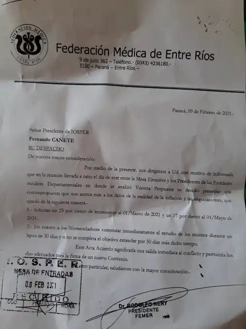 En conferencia de prensa, desde la Federación Médica de Entre Ríos (Femer) informaron que "no aceptamos la propuesta del Iosper un tanto tardía, porque llevábamos más de un mes para reunirnos y si bien queda pendiente una charla técnica, esperamos para tenerla en los próximos días”. “Nosotros iniciamos las negociaciones en noviembre de 2020 ya que en marzo fue el último aumento que recibimos, pero ahora el Iosper propuso un 5 por ciento desde el mes que viene y creemos que es insuficiente, tanto para nosotros como para los 305.000 afiliados”, aseveraron.  Ante la propuesta de la Obra Social, informaron que si bien el Iosper convoca a médicos fuera de femer “están en su derecho de hacerlo, pero le aconsejamos a los colegas que no concurran porque así surgió el conflicto, básicamente por una recomposición salarial que está atrasada ya que nuestra mejora fue del 21 por ciento, y ahora estamos pretendiendo que la inflación sea el punto de referencia”, advirtieron. “Nosotros hemos pedido cantidad de prestaciones, aplicaciones y demás que el Iosper no las cubre, por lo que si el paciente quiere hacer esos estudios no cubiertos por la Obra Social nosotros debemos cobrarlo por afuera y es lo que se conoce como plus, por lo que queremos transparentar esta situación”, remarcaron.  Por último, aseguraron que pidieron una audiencia con el Gobernador para informarle como funciona el Iosper, "ya que hay descontento de los afiliados y de los prestadores, por lo que el conflicto es grande. Y si bien hemos cubierto diversas prestaciones durante la pandemia hemos llegado a un punto donde esto no puede seguir”, concluyeron. Estuvieron presentes en la conferencia Alfreo Angarola, Presidente del Círculo Médico, Rodolfo Negri, Presidente de Femer y Vázquez, Secretario de la Federación Médica.   Convocatoria de gremios en Gualeguaychú Sindicatos y asociaciones que nuclean afiliados a Iosper, como ATE, AGMER, CTA, ATM y CAMAM, entre otros, convocaron a una conferencia de prensa para este miércoles a las 9 de la mañana. A través un comunicado titulado "La salud como derecho humano", anticiparon la preocupación por el funcionamiento de Iosper y el conflicto con FEMER. "La obra social nació siendo un sueño de construcción solidaria entre los trabajadores y se ha convertido en insomnio y pesadilla de muchos", plantearon.   (Fuente: APF - ElDía)
