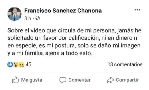 Una estudiante de la facultad de Derecho de la Universidad Michoacana de San Nicolás de Hidalgo (UMSNH), en México, difundió un video en el que se ve que uno de sus profesores la acosa sexualmente en un auto, luego de haberla citado presuntamente para revisar su examen. El video se publicó en la página de Facebook del colectivo Unidad por una Universidad Libre de Acoso, donde se explica que la alumna reprobó la materia dictada por el profesor, y cuando la joven exigió una explicación, el docente la citó en un sitio afuera de la universidad. El hombre le pidió que lo acompañara a un asunto personal y que no demoraría mucho. Pero en el viaje, la empezó a tocar e intentó que ella hiciera lo mismo. En su perfil de Facebook, el maestro acusado, Francisco Sánchez Chanona, publicó un mensaje en el que rechaza las acusaciones y asegura que nunca solicitó "un favor".  En el video que grabó la joven, se muestra cómo el docente le toca la pierna y después le dice "tóquele de regreso". Frente a esta situación, la joven se negó, pero el hombre le tomó la mano y la colocó en su zona genital, por arriba del pantalón. Después, el maestro le dice a la joven "tengo ganas de besarte ahí, ¿puedo?". Ante la negativa nuevamente de la chica, el hombre le vuelve a tomar la mano para ponerla en su área genital mientras le dice "mete las manos". El colectivo informó que tras la publicación del video, recibieron mensajes de otras tres estudiantes para denunciar de acoso al mismo profesor. Además compartieron capturas de pantalla, evidenciando algunos de los mensajes y fotos que les enviaba para pedirles que se vieran afuera de la escuela.  "A través de esta plataforma hoy exigimos justicia para nuestra compañera, que así como a cientas de Nicolaitas son acosadas a diario por profesores al interior de la Universidad Michoacana", denunció la organización. Y agregó: "Venimos a estudiar eso no significa que los profesores tengan que mandarnos mensajes para tratar de sacar ventaja y extorsionarnos por nuestra calificación".  En comunicado, la Facultad de Derecho de la Universidad Michoacana aseguró que tomó conocimiento del caso. Además añadió que se implementó el Protocolo para la Prevención, Actuación y Erradicación de la Violencia de Género para salvaguardar los derechos de la alumna. "El presente asunto se encuentra en manos de las autoridades, por lo que no se puede abundar en ello, por tratarse de un tema que contiene datos personales y de ninguna manera sería positivo profundizar en declaraciones, ya que es preciso no entorpecer la investigación que se tiene prevista por ley", señala el comunicado.  El tema llegó a la Comisión Estatal de los Derechos Humanos (CEDH) de Michoacán que ya comenzó una investigación de oficio por el acoso sexual de la alumna. En un comunicado, la CEDH explicó que inició la queja en contra de un catedrático de la universidad por hostigamiento y acoso sexual. La Comisión destacó que tanto el hostigamiento como el acoso sexual son conductas, que además de ser un delito, transgreden la dignidad y bienestar personal, familiar, académico y laboral de quienes lo sufren; además de que vulneran el derecho de las mujeres a convivir en espacios libres de violencia.