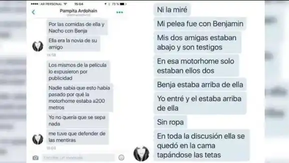 En diciembre de 2015 se desató el ya mítico escándalo del motorhome, cuando Pampitahabría descubierto a Benjamín Vicuña manteniendo relaciones con la China Suárez, en el marco de la filmación de El Hilo Rojo, algo que los actores negaron. Pocos meses después, la China y el chileno confirmaron el romance. La relación se afianzó, fruto de la cual nació Magnolia (1 año y 6 meses). Por ese entonces, Pampita reveló en BDV que vio “lo peor que podía ver una mujer” y remató enfática qué fue lo que observó estupefacta: "A ellos dos teniendo sexo. Lo juro por mis hijos”. Días después, la China se defendió en Intrusos y negó las acusaciones de la exmujer de Vicuña: "Lo único que tengo para decir es que yo estaba trabajando en la costanera, en un exterior, en un motorhome que lo usamos todos, estaba la productora, Benjamín, estaba yo recostada con una manta amarilla que traje de Nepal y entró una persona completamente fuera de sí. Prefiero no dar detalles porque no me gusta el escándalo, lo único que puedo decir es que fui agredida física y verbalmente”. Pasada la polémica, en las últimas horas resurgió a raíz de la filtración de una supuesta charla que Pampita mantuvo con Lio Pecoraro en plena crisis conyugal. Allí, la jurado de ShowMatch le precisó al periodista los detalles de su vivencia en el set de rodaje de la película de Daniela Goggi: “Los mismos de la película lo expusieron (la supuesta infidelidad entre la China Suárez y Vicuña) por publicidad. Nadie sabía que esto había pasado porque la motorhome estaba a 200 metros. Yo no quería que se sepa nada. Me tuve que defender por las mentiras”. Más adelante, Pampita habría explicado qué pasó la noche de la discordia: “Ni la miré (a la China), mi pelea fue con Benjamín, mis dos amigas estaban abajo y son testigos. En ese motorhome solo estaban ellos dos, Benja estaba arriba de ella, yo entré y el estaba arriba de ella, sin ropa. En toda la discusión ella se quedó en la cama tapándose las tetas”. Un nuevo capítulo en la historia de nunca acabar entre Pampita, la China Suárez y Benjamín Vicuña, a días de que la protagonista de ATAV saliera a rechazar las versiones de crisis con el padre de su beba.
