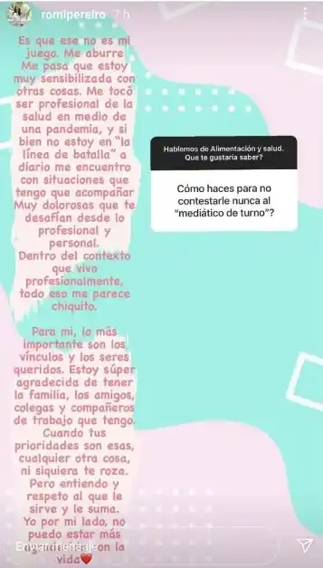 Esta semana, Angie Balbiani visitó Los Ángeles de la Mañana y se refirió a su polémica salida de Intrusos en febrero de 2020, que se dio en medio de rumores de celos de Romina Pereiro, esposa de Jorge Rial. Angie desmintió de forma tajante cualquier tipo de relación con Rial y reconoció que una actitud de ella le habría molestado a Romina: “Ella no me llamó. Eso molestó. Yo le traje habanos porque me había ayudado con una negociación. Eran cuatro y de hecho los compro Juan, mi novio”, aseguró la periodista. Días después de la aparición de Angie en LAM y la repercusión de sus dichos, una seguidora le preguntó a Romina a través de Instagram Stories: “¿Cómo hacés para no contestarle nunca al ‘mediático de turno’?”, le consultó. Entonces, Pereiro realizó un fuerte descargo, sin nombrar a Angie, pero dejando en claro por qué no le da importancia a este tipo de conflictos mediáticos: “Es que ese no es mi juego. Me aburre, me pasa que estoy muy sensibilizada con otras cosas. Me tocó ser profesional de la salud en medio de una pandemia, y si bien no estoy en ‘la línea de batalla’, a diario me encuentro con situaciones que tengo que acompañar, muy dolorosas, que te desafían desde lo profesional y personal”. “Dentro del contexto que vivo profesionalmente, todo esto me parece chiquito. Para mí, lo más importante son los vínculos y los seres queridos. Estoy súper agradecida de tener la familia, los amigos, colegas y compañeros de trabajo que tengo. Cuando tus prioridades son esas, cualquier otra cosa, ni siquiera te roza. Pero entiendo y respeto al que le sirve y le suma. Yo por mi lado, no puedo estar más que agradecida con la vida”, cerró contundente.