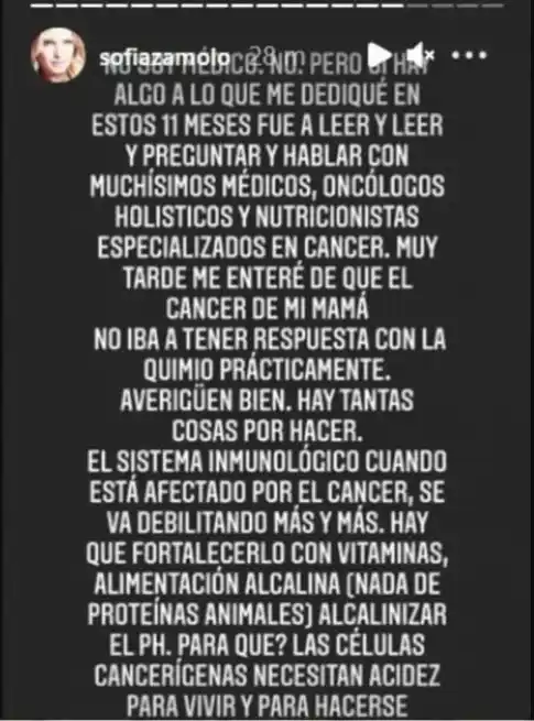 A poco de la muerte de su amada mamá, Cristina Guerrero, Sofía Zámolo publicó un desgarrador mensaje. Y, días más tarde, apuntó con fuerza contra la medicina tradicional y cuestionó el tratamiento que le indicaron a su madre, quien falleció de cáncer de hígado y páncreas. "Mi reina, qué injusto. Tantas cosas hoy sé que no hubiésemos hecho. Quimios que no tenían porcentaje ni chances de mejorar tu cáncer, pero sí de perjudicar tu calidad de vida... Pero nadie nos lo dijo", se lamentó a través de sus stories de Instagram junto a una foto de su mamá. Y les dio un consejo a sus seguidores: "Averigüen bien, investiguen bien. Pregunten, lean, infórmense sobre todo lo que hoy hay para tratar o curar el cáncer, porque a mí me llegó mucha información, pero tarde". En ese punto, hizo una tajante aclaración: "No soy médica, pero si hay algo a lo que me dediqué en estos 11 meses fue a leer, preguntar y hablar con muchísimos médicos, oncólogos, holísticos y nutricionistas especializados en cáncer. Muy tarde me enteré de que el cáncer de mi mamá no iba a tener respuesta con la quimioterapia. Averigüen bien, hay tantas cosas por hacer". Antes de cerrar, se refirió a cómo el cáncer debilita el sistema inmunológico y destacó la importancia de una alimentación, según Sofía, lejos de la proteína animal.