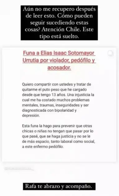 Rafaela Vicuña, la sobrina de Benjamín Vicuña, alzó su voz en Instagram y se animó a contar que fue violada a los 13 años por una persona, que en ese entonces tenía 24. La joven brindó fuertes detalles de la gravísima y lamentable situación que sufrió cuando era niña en un campamento de música. "Por favor, si conocen a chicas que pasaron por lo mismo con esta persona o lo conocen, contáctenme. Estoy haciendo una carpeta con testimonios para llevarla a la Fiscalía y ya tengo varios. Todo se devuelve...", escribió junto a su testimonio. Al leer las desgarradoras palabras de Rafaela, China Suárez se mostró sorora y además de compartirlas admitió que se sintió muy afectada. "Aún no me recupero después de leer esto. ¿Cómo pueden seguir sucediendo estas cosas? Atención Chile, este tipo está suelto”, escribió a través de sus stories. Y se despidió dedicándole un profundo mensaje: "Rafa, te abrazo y te acompaño", expresó. Si sufrís, sufriste o conocés a una persona víctima de violencia de género, podés comunicarte todos los días y de forma gratuita con la línea 144.