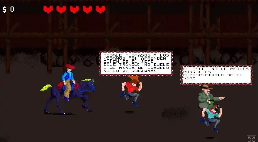 Durante la semana, un grupo de veganos irrumpió en la Exposición de la Sociedad Rural con pancartas contra lo que denominan la "Explotación animal". Mientras se realizaba un desfile, bajaron a la pista con carteles en defensa de los animales y contra la explotación. La acción fue organizada por DxE Buenos Aires (Direct Action Everywhere), y entre los silbidos y las quejas del público, algunos decidieron pasar a la acción directa: los corrieron a rebencazos, los escupieron y los agredieron a modo de protesta contra la misma protesta. Pero este hecho no solo generó un masivo debate en redes sociales y en los distintos medios de comunicación, sino que además fue aprovechado por la gente de Shitty Games para desarrollar un juego online que tiene como protagonista una suerte de concurso de “doma de veganos”.  El juego lleva como nombre  "Sunset Gauchers", basado en el popular “Sunset Riders” (el juego basado en el lejano oeste desarrollado por Konami en 1991), y tiene como objetivo atrapar, cazar o golpear a los veganos que ingresaron con carteles en defensa de los animales.  Al comenzar, el usuario deberá elegir entre tres personajes: Fachito Gil, Rigaucho Iorio o Horacio Guaranismanlomataron. Durante la animación, van apareciendo veganos que el personaje debe ir golpeando para conseguir dinero, mientras que –a su vez- debe evitar golpear al “jefe” (una suerte de organizador del evento), ya que si no le restará puntos al marcador final.  Al comenzar el juego, en la pantalla de instrucciones reza el siguiente mensaje: "Un poquito de agrotóxicos para mayor placer, no ves que la pasan bien". Y, poco antes de comenzar, agrega: "Pegale fustazos a los veganos así aprenden quién es el jefe. Dale tranqui, no duele, o al menos al caballo no lo vi quejarse". Shitty Games es conocido por elaborar juegos en la web basados en los acontecimientos que generaron polémica. Por ejemplo, en la página exhibe un juego en alusión al cántico contra Mauricio Macri que se hizo popular durante el verano o  “Chanoggedon“, basado en los reiterados accidentes automovilísticos del ex líder de Tan Biónica. Para jugar a "Sunset Gauchers", hacé click aquí