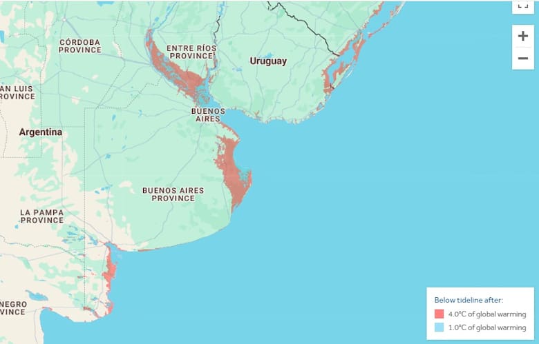 En la Argentina, las zonas más afectadas serían parte de las provincias de Buenos Aires y de Entre Ríos, como se dijo, que podrían quedar bajo el nivel del mar en un escenario de suba global de la temperatura de 3 o 4 grados por encima de los valores preindustriales. En los mapas de esa publicación, la zona del delta del Paraná y la costa del Río de la Plata y la Bahía de Samborombón aparecen identificadas como sensibles. “Se destaca el delta del Paraná y gran parte del este de la provincia de Buenos Aires”, detalló la especialista del SMN.