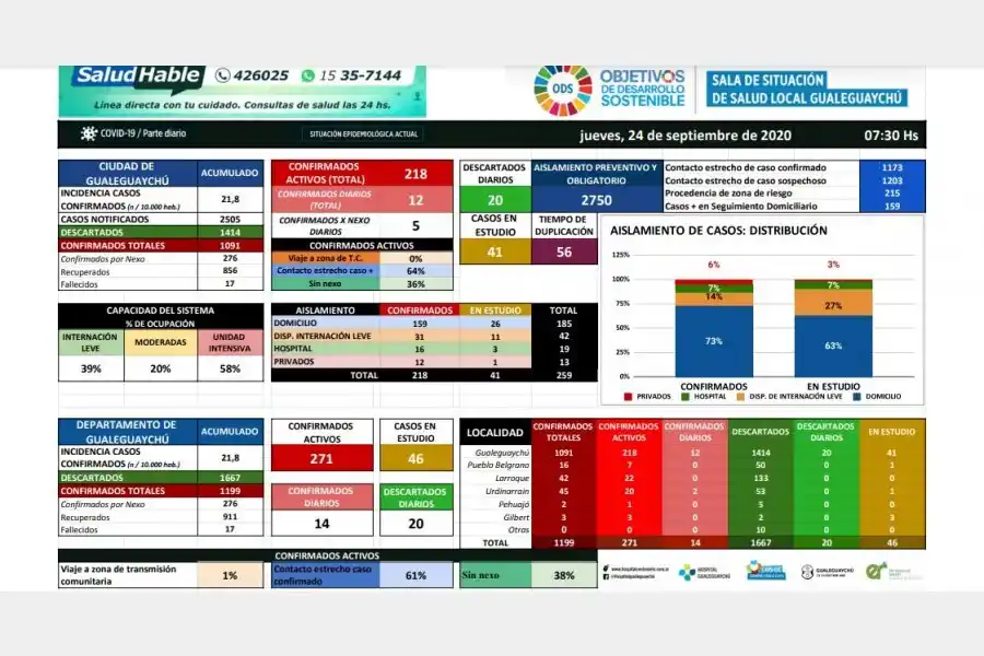 Este miércoles el Hospital Centenario confirmó que de los 12 casos confirmados, 5 fueron diagnosticados por nexo. En aislamiento social, preventivo y obligatorio continúan más de 2700 personas, mientras que el tiempo de duplicación de casos continúa extendiéndose y ya alcanza los 56 días. Los confirmados desde el inicio de la pandemia suman 1091, aunque los que continúan activos son 218. Respecto de la ocupación de camas detallaron que en la Unidad de terapia intensiva es del 58%; en el sector de pacientes moderados es del 20% y un 39% de ocupación en internación leve. EL INFORME COMPLETO