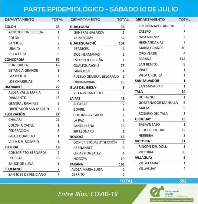 En total, se registraron 102 casos de coronavirus en el departamento. Además, en Entre Ríos hubo 592.