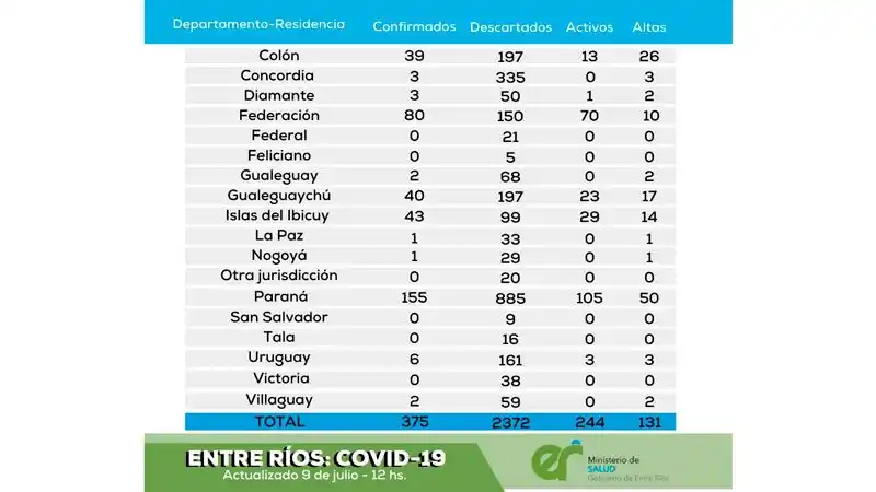 En medio de un crecimiento sostenido de los casos de coronavirus en Entre Ríos, que este jueves totalizaron los 375 desde el inicio de la pandemia, también, como era de esperar, comenzó a hacerse más notoria la cantidad de pacientes recuperados. Teniendo en cuenta que es el departamento con mayor cantidad de casos detectados (155), de los cuales 105 están activos, Paraná también encabeza el listado de distritos con pacientes recuperados: En total son 50 curados. En tanto, en segundo lugar, se encuentra el departamento Colón con 26 pacientes de alta y luego Gualeguaychú con 17 externados. Más abajo aparecen los 14 pacientes de Islas del Ibicuy, 10 recuperados en departamento Federación. Por su parte, en lo que refiere a los departamentos con mayor cantidad de casos, se puede mencionar a Paraná, Federación, Islas, Colón y Gualeguaychú. Luego aparecen el resto en los que se ha detectado la enfermedad, pero con números muy inferiores, ya que solamente cuentas con uno, dos o tres casos. Por otra parte, Federal, Feliciano, Victoria, Tala y San Salvador son los departamentos que siguen sin registrar casos. (Fuente: El Once)